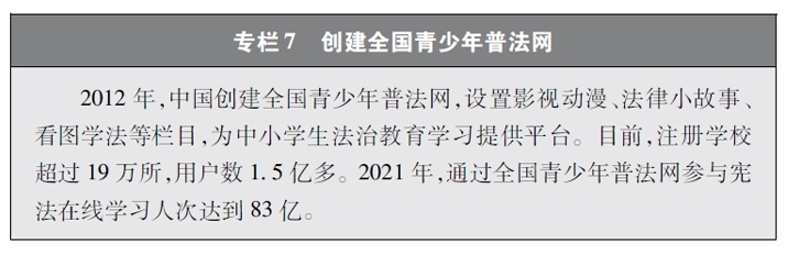 加強(qiáng)青少年網(wǎng)絡(luò)法治宣傳教育。青少年是祖國的未來、民族的希望。青少年網(wǎng)民在中國網(wǎng)民中的占比逐步增長。作為互聯(lián)網(wǎng)的“原住民”,青少年是網(wǎng)上學(xué)習(xí)、交流、生活最活躍的參與者、實(shí)踐者,其合法權(quán)益也更易受到網(wǎng)絡(luò)違法活動的侵害。中國從保護(hù)青少年網(wǎng)絡(luò)權(quán)益,促進(jìn)青少年健康成長、全面發(fā)展出發(fā),遵循青少年身心發(fā)展規(guī)律,貼近青少年學(xué)習(xí)生活實(shí)際,聚焦網(wǎng)絡(luò)沉迷、網(wǎng)絡(luò)欺凌、網(wǎng)絡(luò)淫穢色情信息等重點(diǎn)問題,通過普法微綜藝、兒童普法話劇、網(wǎng)絡(luò)普法故事廣播、網(wǎng)絡(luò)普法云課堂、學(xué)法用法知識競賽、法治副校長進(jìn)校園、編寫網(wǎng)絡(luò)普法讀本等生動活潑、豐富多彩的形式開展法治宣傳教育,逐步形成了政府、社會、學(xué)校、家庭相結(jié)合的法治宣傳教育格局,為提升青少年網(wǎng)民法治意識和網(wǎng)絡(luò)安全素養(yǎng)提供了全面保障。