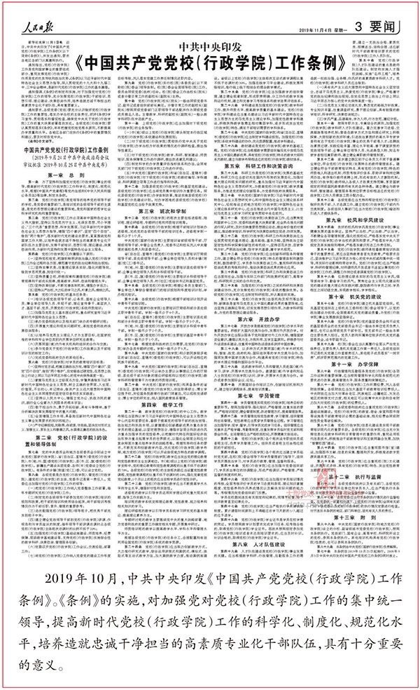 黨校事業(yè)是黨的事業(yè)的重要組成部分。從中央到地方建立黨校體系,專門教育培訓(xùn)干部,是我們黨的一大政治優(yōu)勢。黨的十八大以來,習(xí)近平總書記高度重視黨校工作。從為黨內(nèi)“關(guān)鍵少數(shù)”講授“開班第一課”,與縣委書記研修班學(xué)員座談交流,到連續(xù)6次出席中青年干部培訓(xùn)班開班式并發(fā)表重要講話;從出席全國黨校工作會議并發(fā)表重要講話,指引做好新形勢下的黨校工作,到部署深化黨和國家機構(gòu)改革,組建新的中央黨校(國家行政學(xué)院),制定、實施《中國共產(chǎn)黨黨校(行政學(xué)院)工作條例》,習(xí)近平總書記對黨校工作傾注了大量心血。在總書記親切關(guān)懷下,中央黨校和全國各級黨校牢記“黨校姓黨”這個立校之本,不斷提高辦學(xué)質(zhì)量和水平,在為黨育才、為黨獻策上作出了新的貢獻。