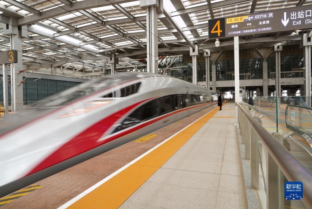 一輛高鐵列車(chē)駛離京雄城際鐵路雄安站,開(kāi)往北京(2023年3月22日攝)。新華社記者 牟宇 攝