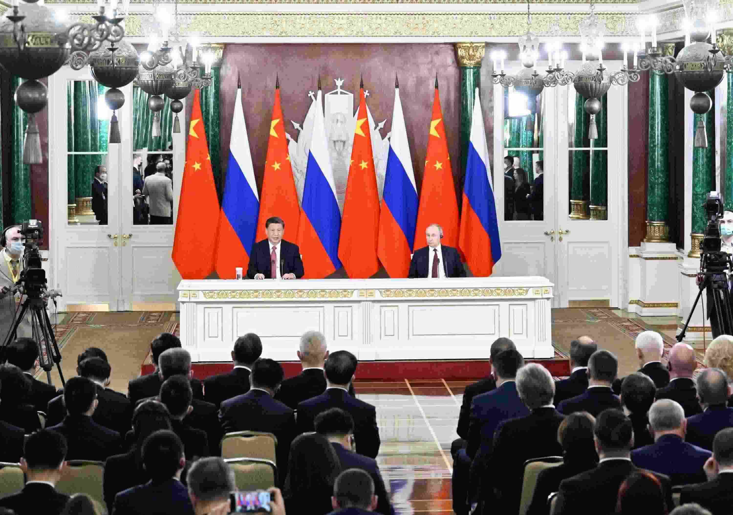 當?shù)貢r間3月21日下午,國家主席習近平在莫斯科克里姆林宮同俄羅斯總統(tǒng)普京舉行會談。這是會談后,兩國元首共同會見記者。