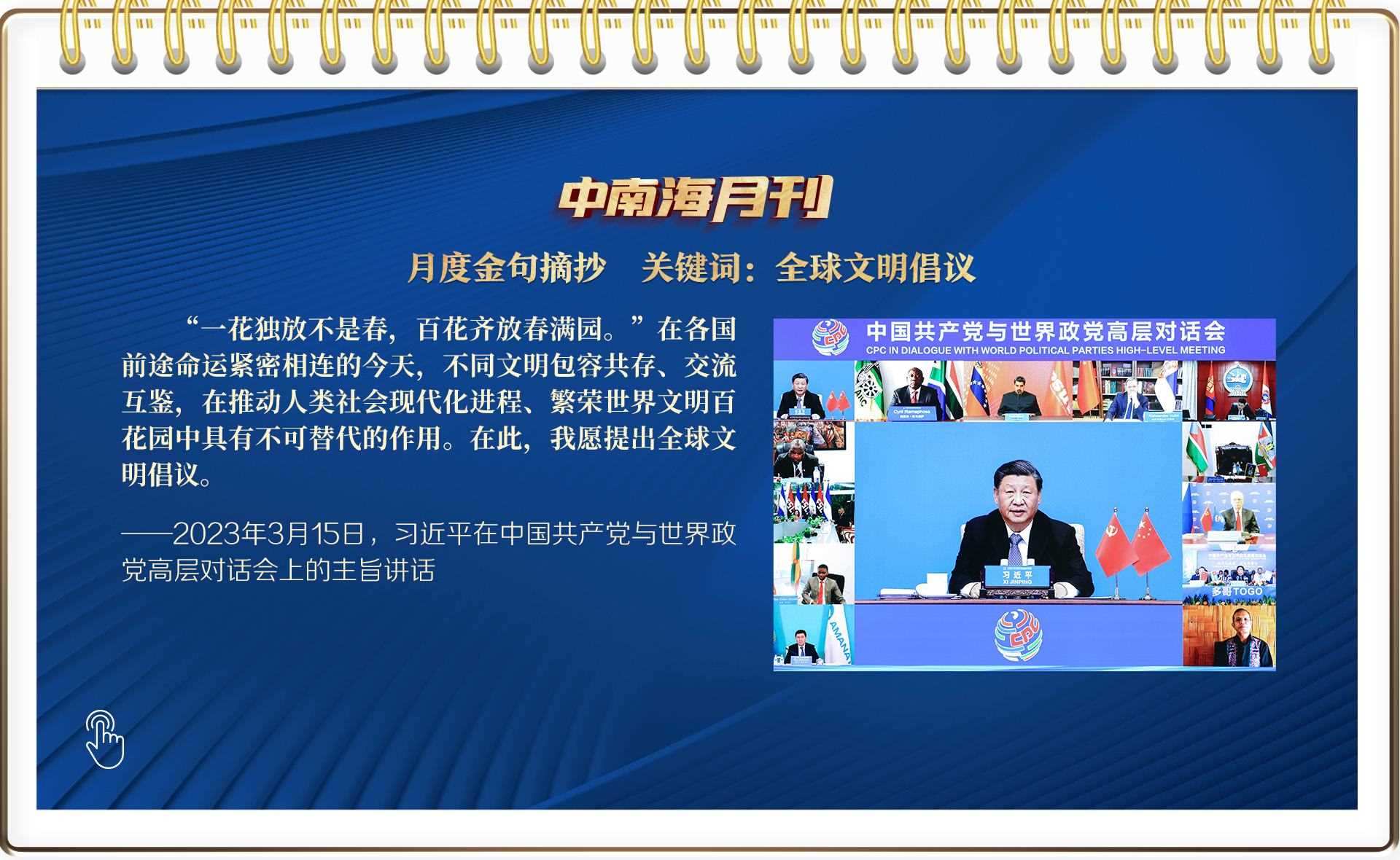 帶著對人類文明過去、現(xiàn)在和未來的深邃思考,習近平總書記在本月舉辦的全球性政黨盛會上,以四個“共同倡導”為實現(xiàn)路徑,鄭重提出全球文明倡議。繼全球發(fā)展倡議、全球安全倡議之后,這一中國智慧再次引發(fā)全球共鳴。