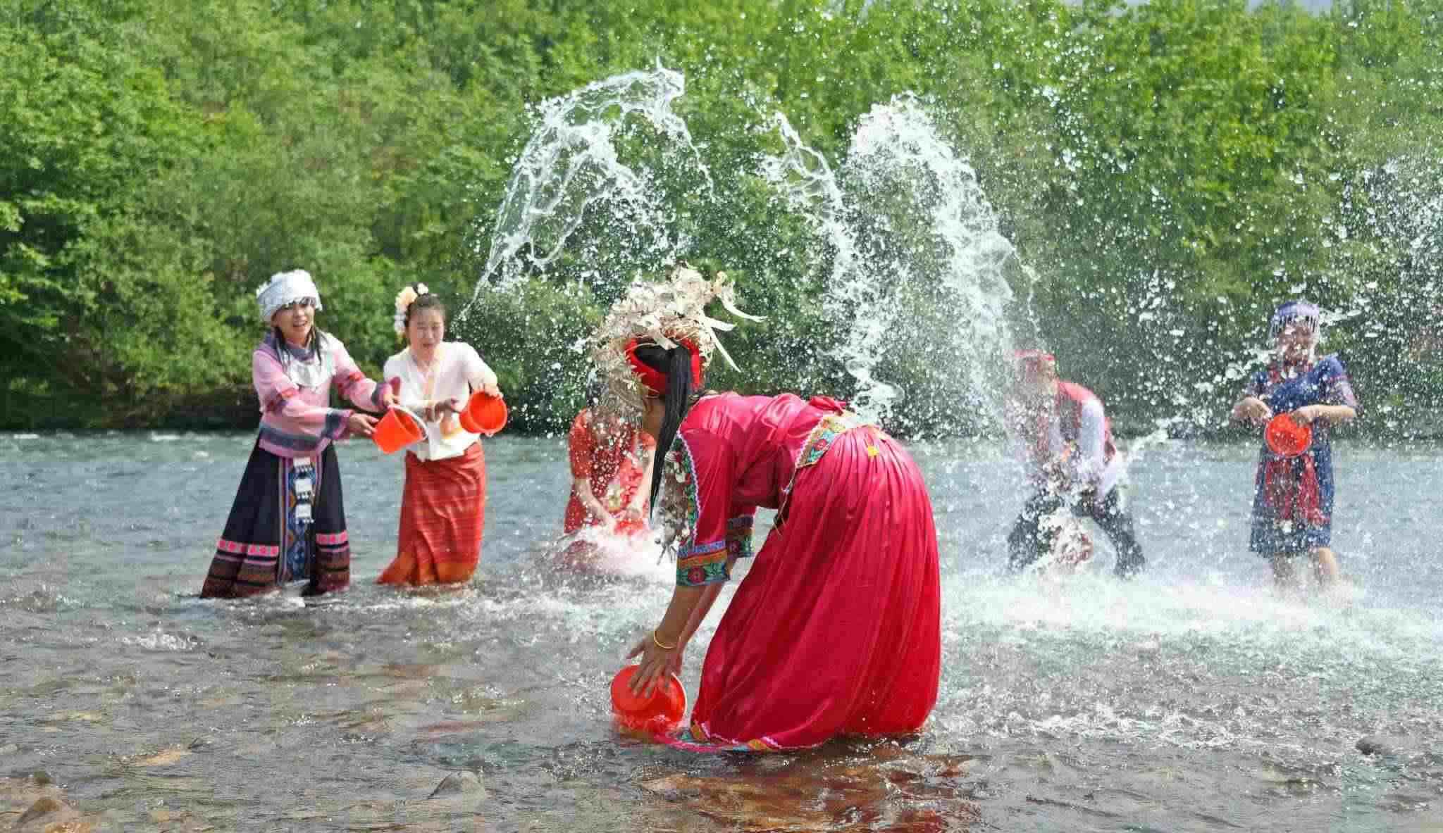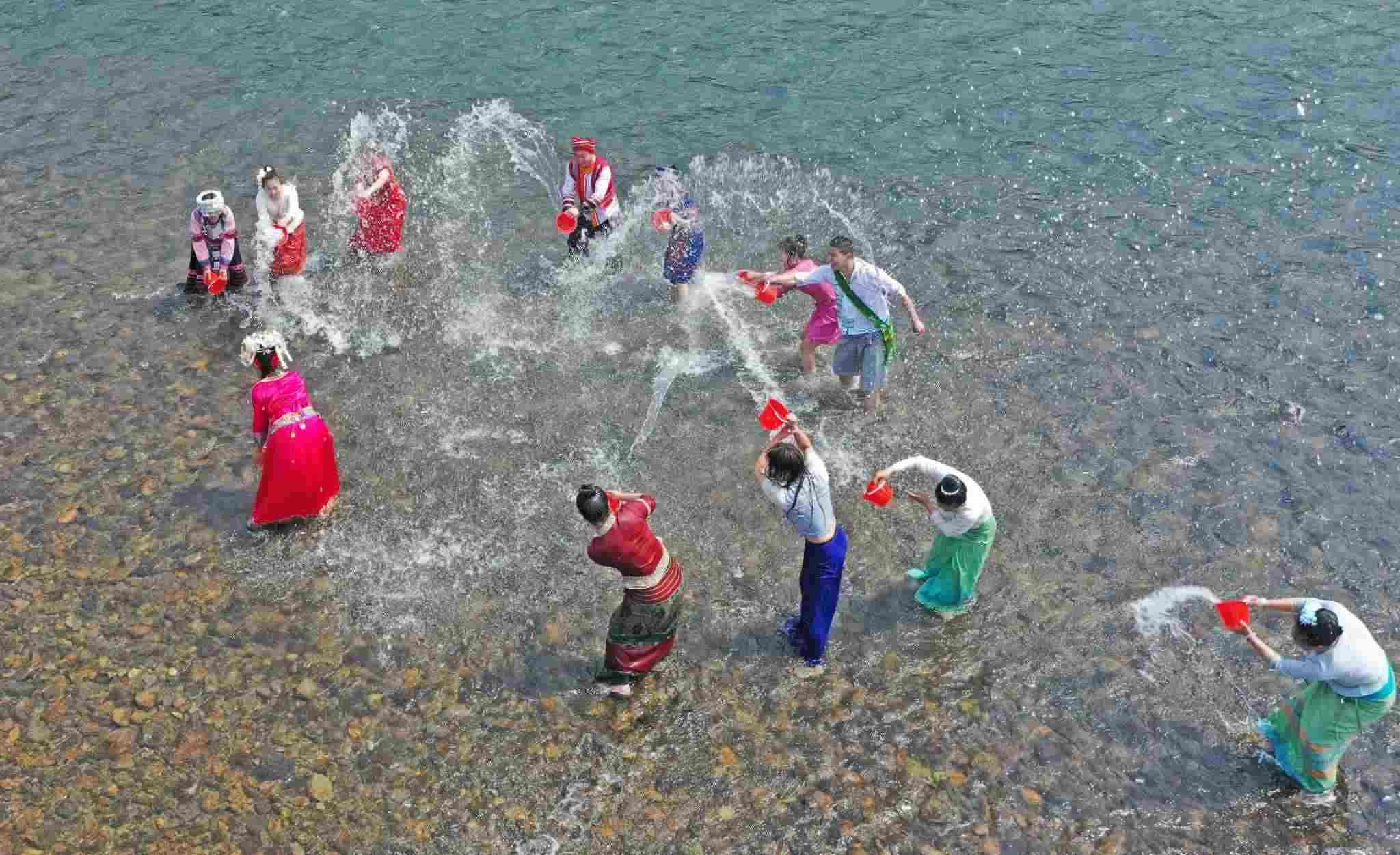 2023年4月12日,浙江臺州,仙居縣永安溪畔,傣族同胞正在參加潑水狂歡活動。視覺中國