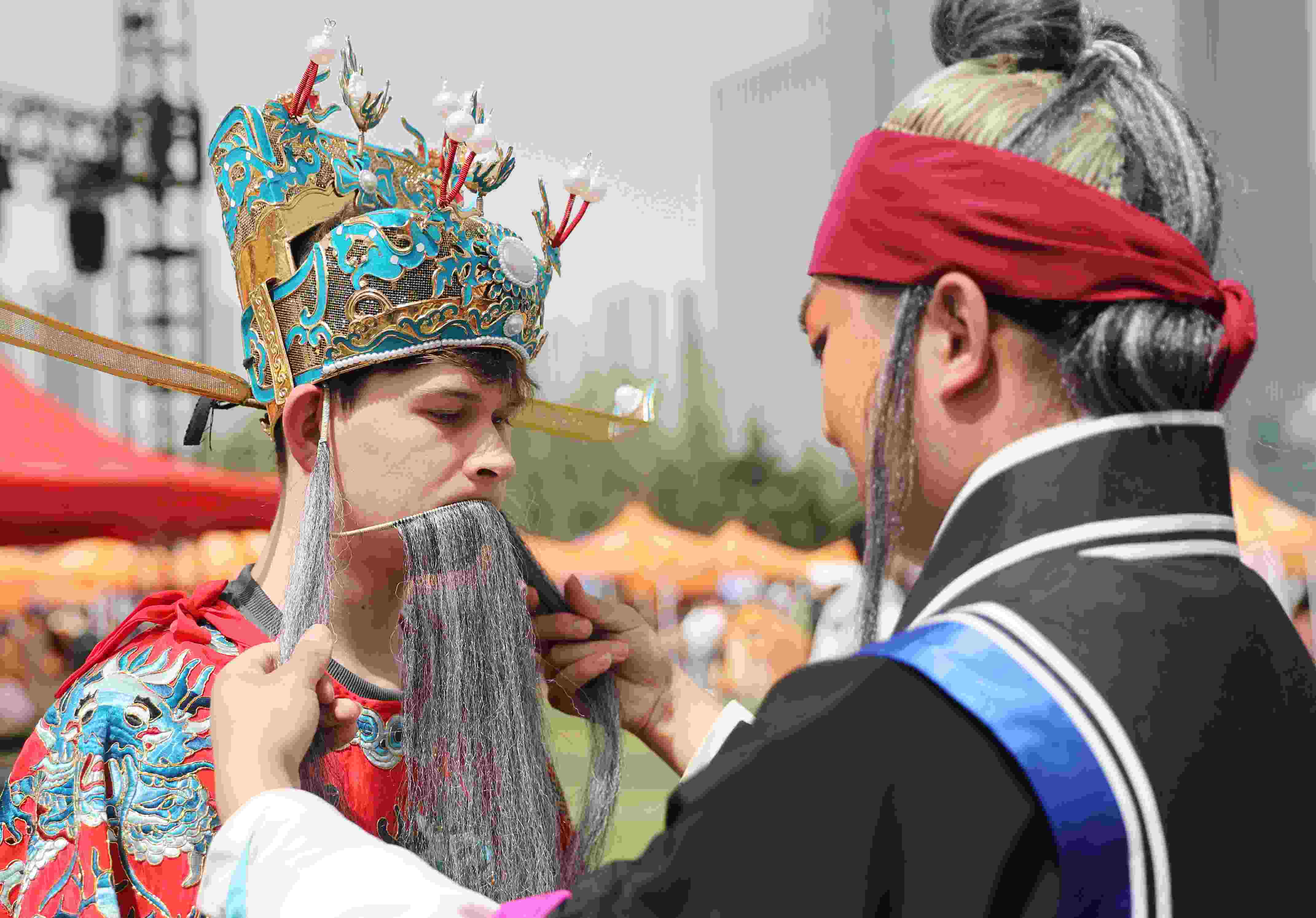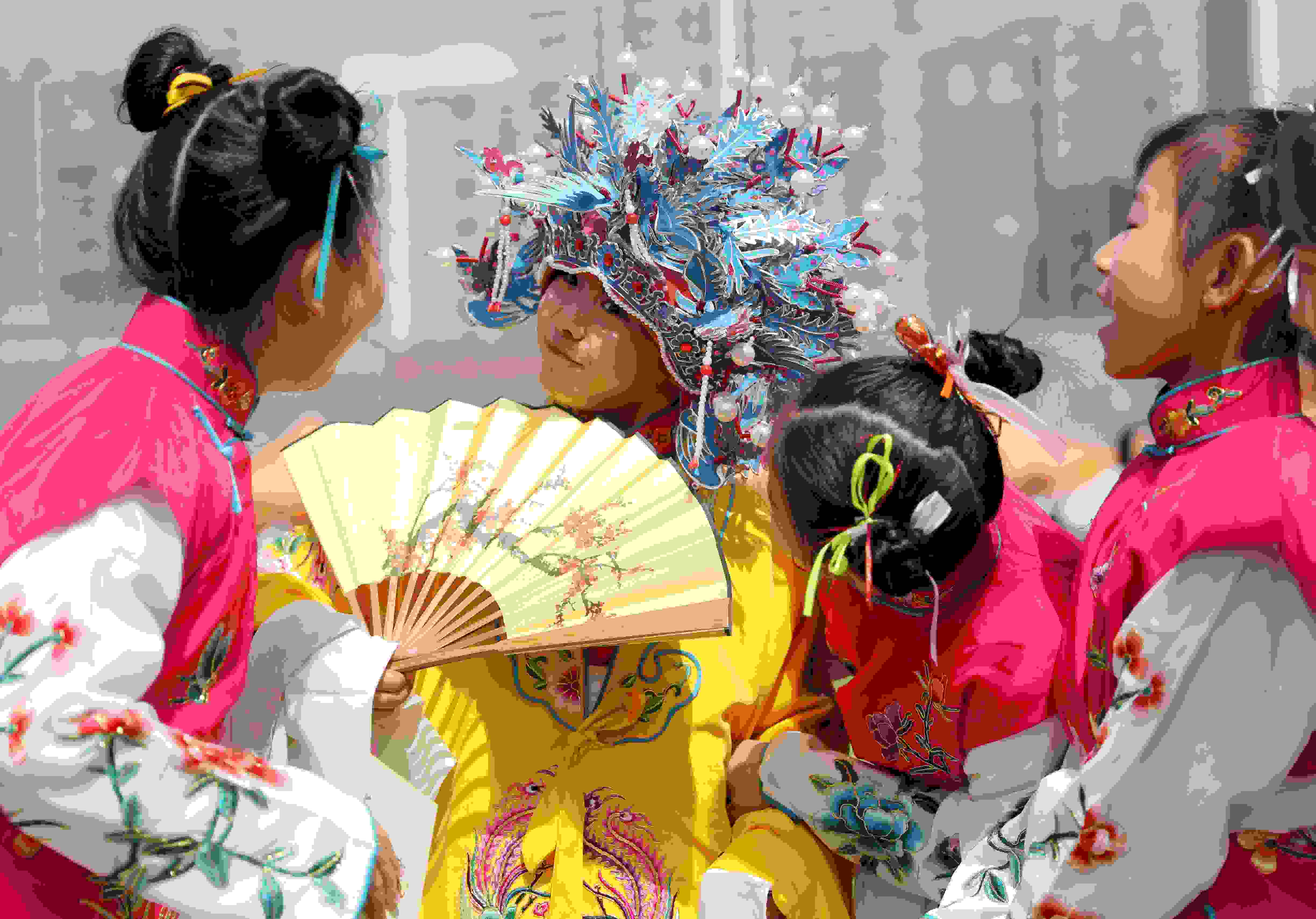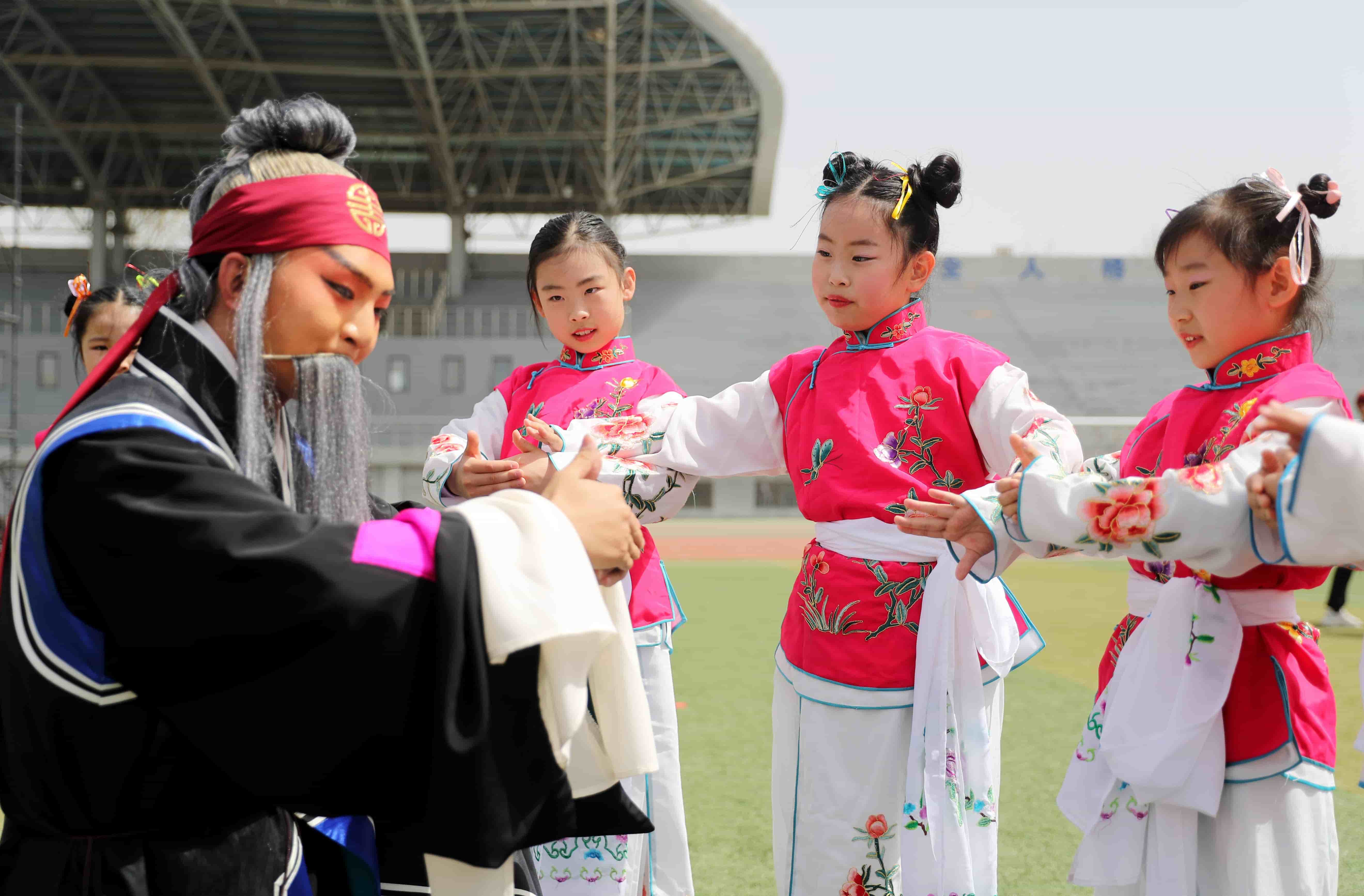 4月15日,山東青島,中國石油大學(xué)(華東)韻遠(yuǎn)京劇隊(duì)的同學(xué)們聯(lián)合青島西海岸新區(qū)珠江路小學(xué)的小學(xué)生們在大學(xué)校園里上演了一堂生動的戲曲普及課。