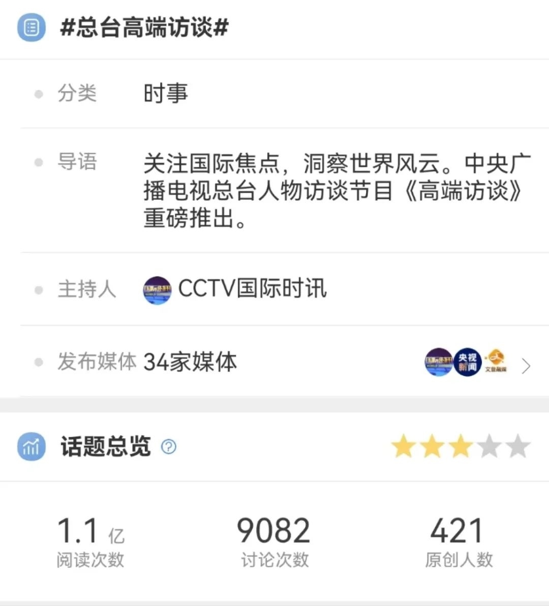 采訪國(guó)際政要+周更+30分鐘的時(shí)長(zhǎng),總臺(tái)《高端訪談》如何打造兼具全球視野和中國(guó)風(fēng)范的精品力作,講好新風(fēng)撲面、真誠(chéng)親和的文明互鑒故事?這檔訪談欄目,何以“高端”?