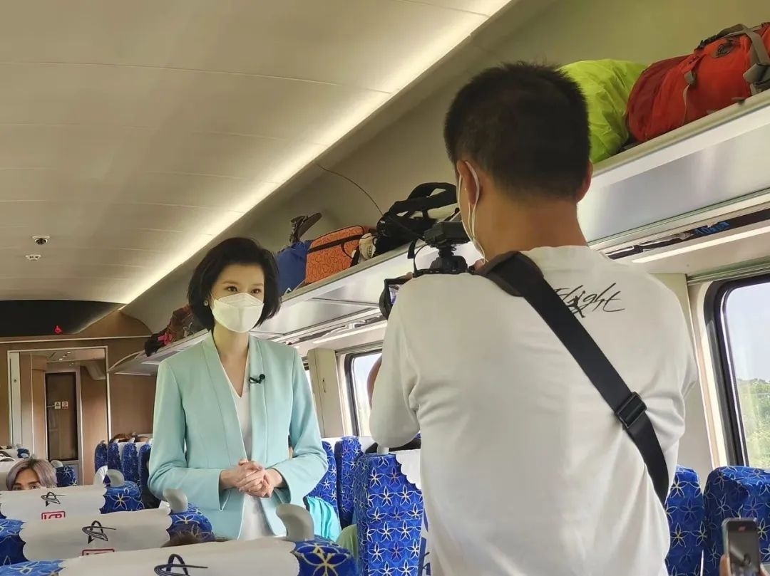 △總臺(tái)主持人鄒韻在中老鐵路“瀾滄號(hào)”動(dòng)車上采訪