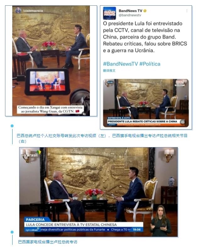 盧拉總統(tǒng)在其個(gè)人社交賬號(hào)轉(zhuǎn)發(fā)此次專訪視頻。巴西第二大電視臺(tái)旗手電視臺(tái)綜合頻道,在當(dāng)?shù)貢r(shí)間4月14日晚率先播出總臺(tái)《高端訪談》專訪盧拉總統(tǒng)的精華版,觸達(dá)巴西全境,完整版專訪于次日在該臺(tái)各頻道多次播出。巴西最大新聞門戶網(wǎng)站UOL、知名雜志《論壇》等也陸續(xù)上線本次專訪節(jié)目。