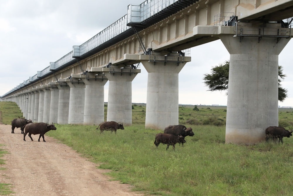 水牛在裝有聲屏障的肯尼亞內(nèi)羅畢國(guó)家公園特大橋下穿行(2021年5月19日攝)。中非共建的肯尼亞內(nèi)馬鐵路采用特大橋全程穿越內(nèi)羅畢國(guó)家公園方案,橋墩超過(guò)6米,讓長(zhǎng)頸鹿也能“昂首通過(guò)”;特大橋護(hù)欄兩側(cè)安裝聲屏障,極大降低火車通過(guò)時(shí)的噪音。