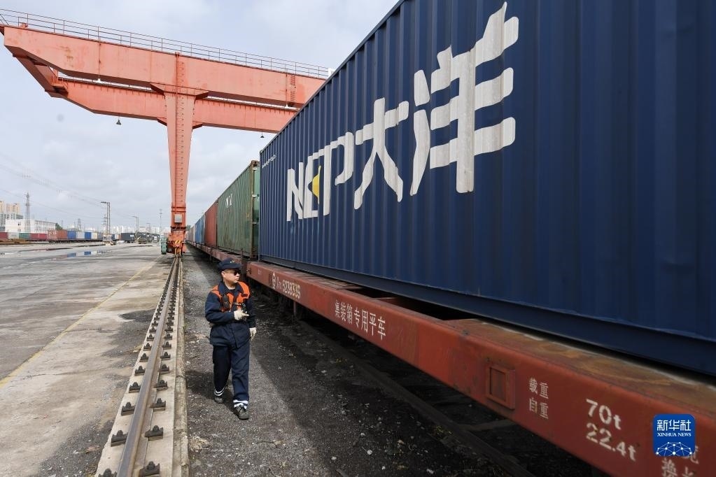 4月28日,工作人員在進(jìn)行班列開(kāi)行前的檢查工作。