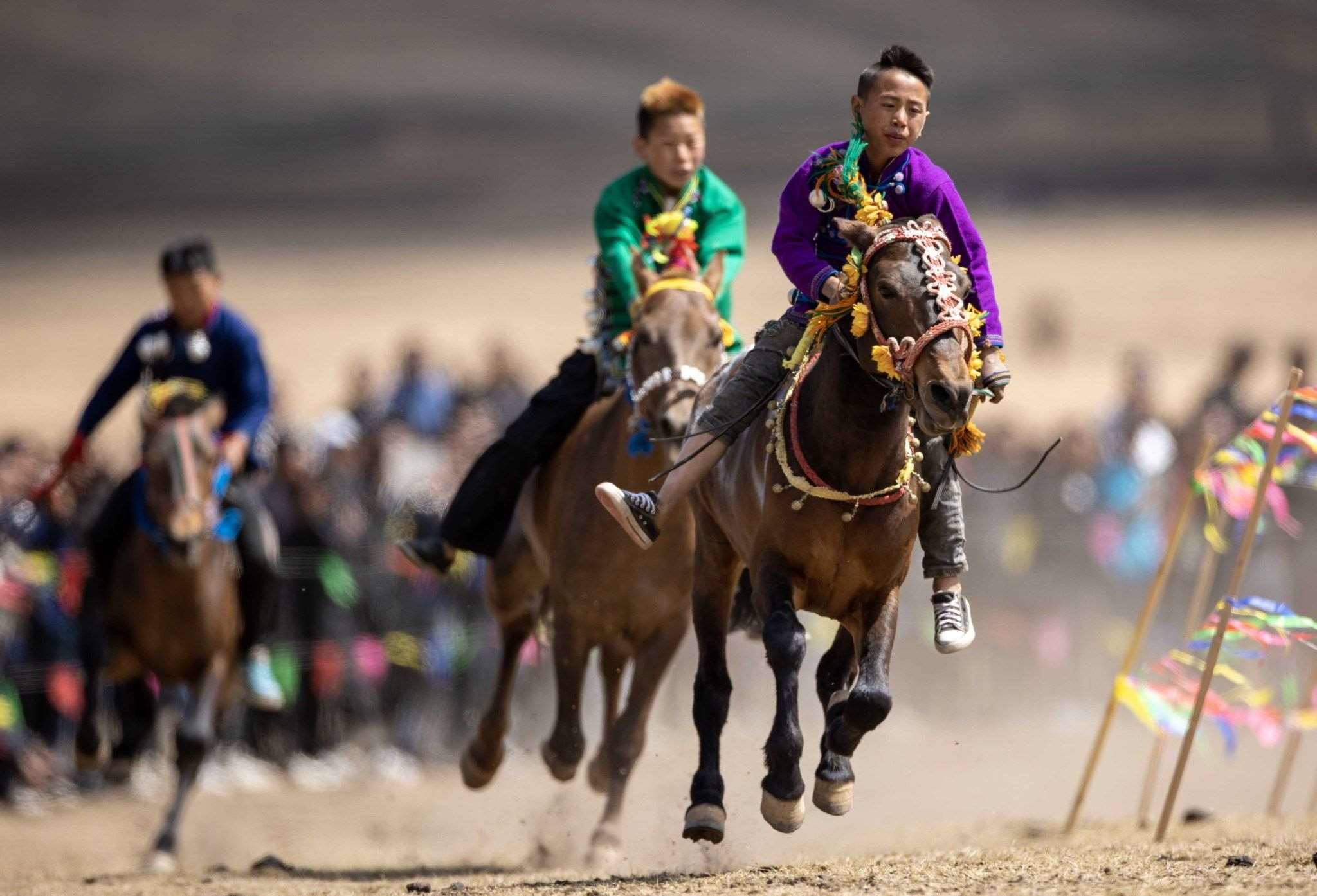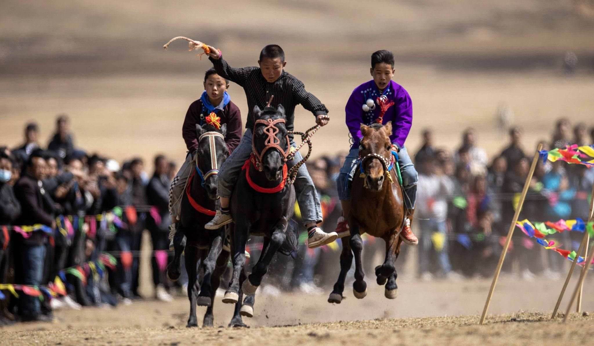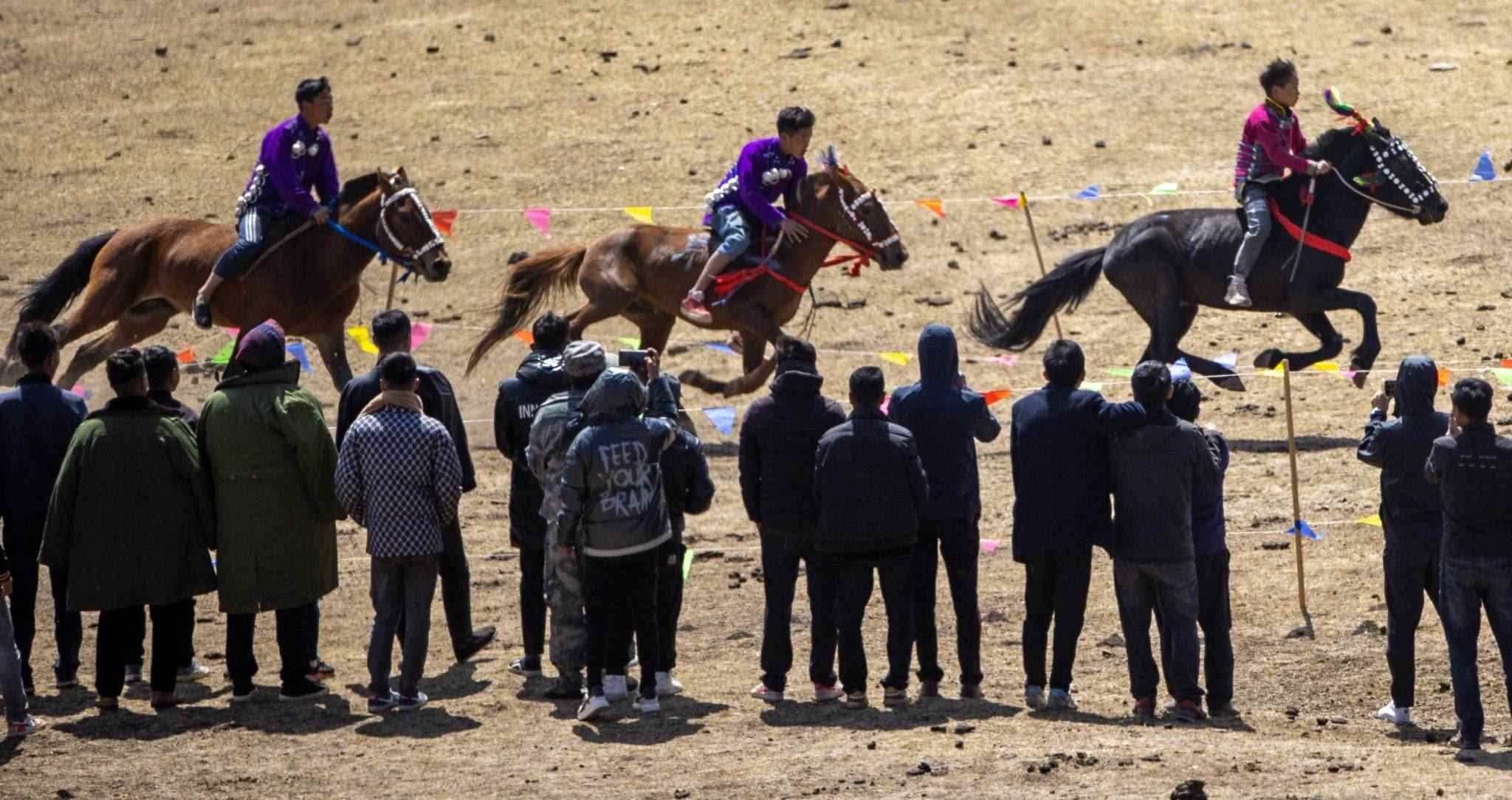 2023年4月25日,四川涼山,普格縣黎安鄉(xiāng)??诹鹤?,傳統(tǒng)的彝族賽馬比賽拉來(lái)帷幕。視覺(jué)中國(guó)