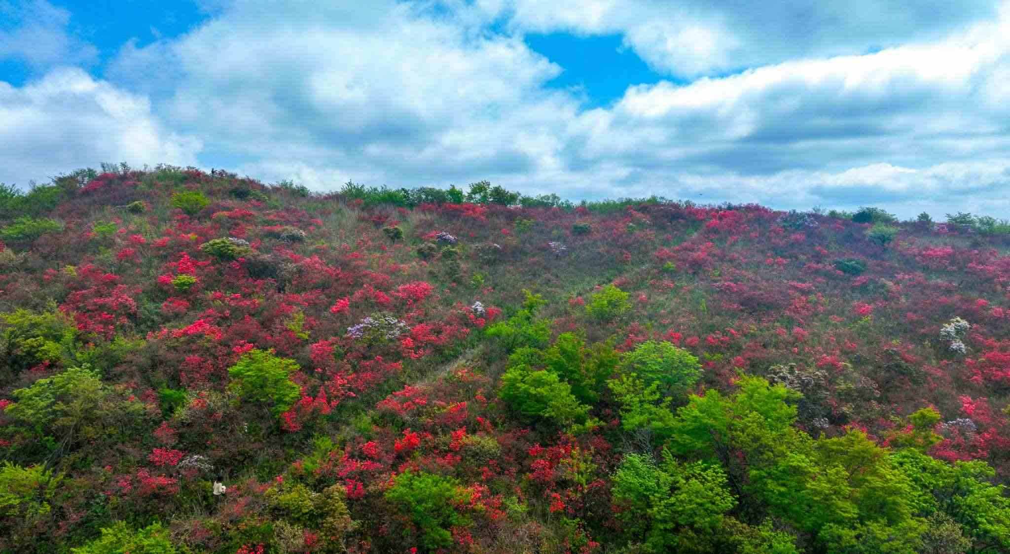 2023年4月26日,杭州,淳安縣楓樹嶺鎮(zhèn)白馬乳洞山自然村,海拔1320米的黃茅尖上千畝野生杜鵑花開正艷。視覺中國(guó)