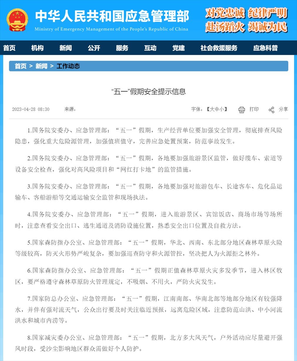 1.國務(wù)院安委辦、應(yīng)急管理部:“五一”假期,生產(chǎn)經(jīng)營(yíng)單位要加強(qiáng)安全管理,徹底排查風(fēng)險(xiǎn)隱患,強(qiáng)化重大危險(xiǎn)源管理,加強(qiáng)值班值守,完善應(yīng)急處置預(yù)案,防范事故發(fā)生。
