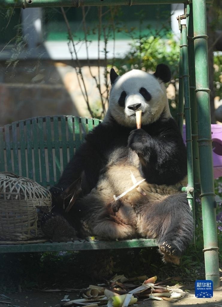 4月30日,在北京動(dòng)物園大熊貓館,大熊貓“萌蘭”在吃竹筍。