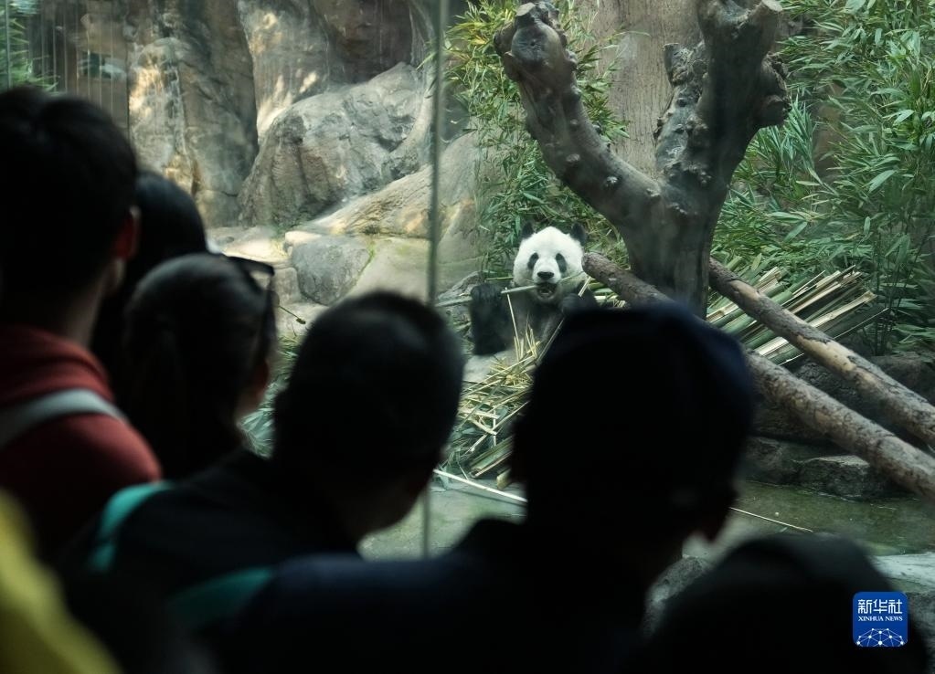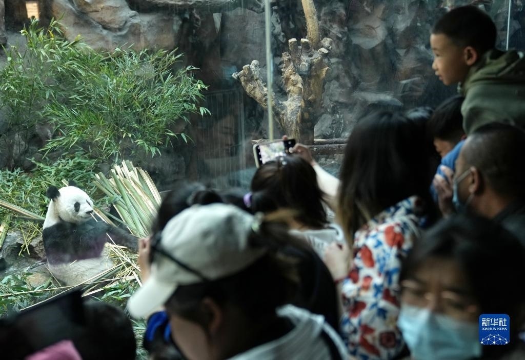 4月30日,游客在北京動(dòng)物園大熊貓館觀賞大熊貓。