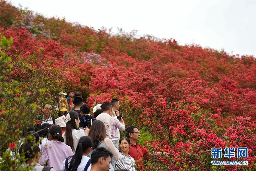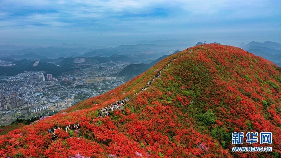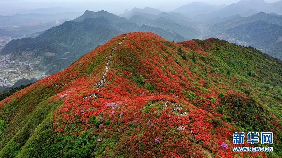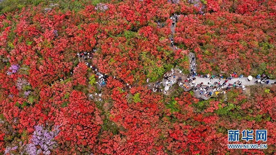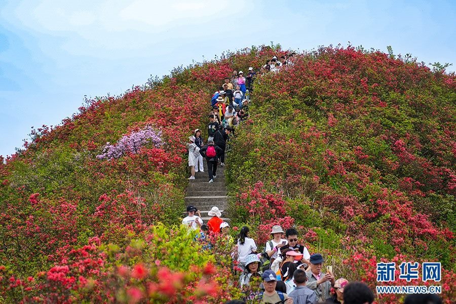 當日,在貴州省黔東南苗族侗族自治州丹寨縣縣城邊海拔1400多米的龍泉山,萬畝杜鵑花競相綻放,山谷間、棧道旁、懸崖上,一顆顆、一簇簇、一朵朵杜鵑花迎風搖曳,形成浩瀚花海,引來眾多游客登高望遠,飽覽靈山秀水之美。