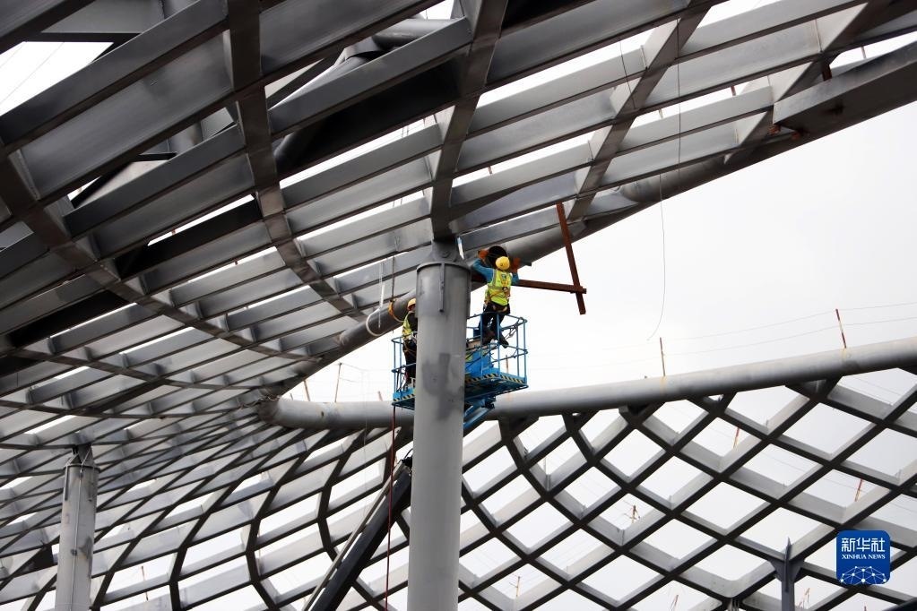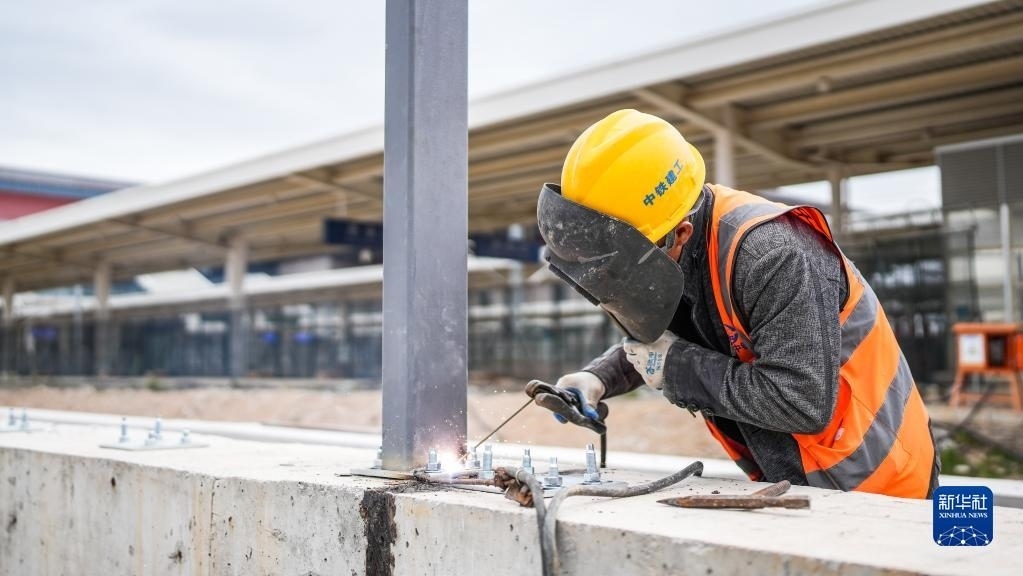 5月1日,中鐵建工集團(tuán)工人在貴州貴安新區(qū)貴安站擴(kuò)建項(xiàng)目工地施工。