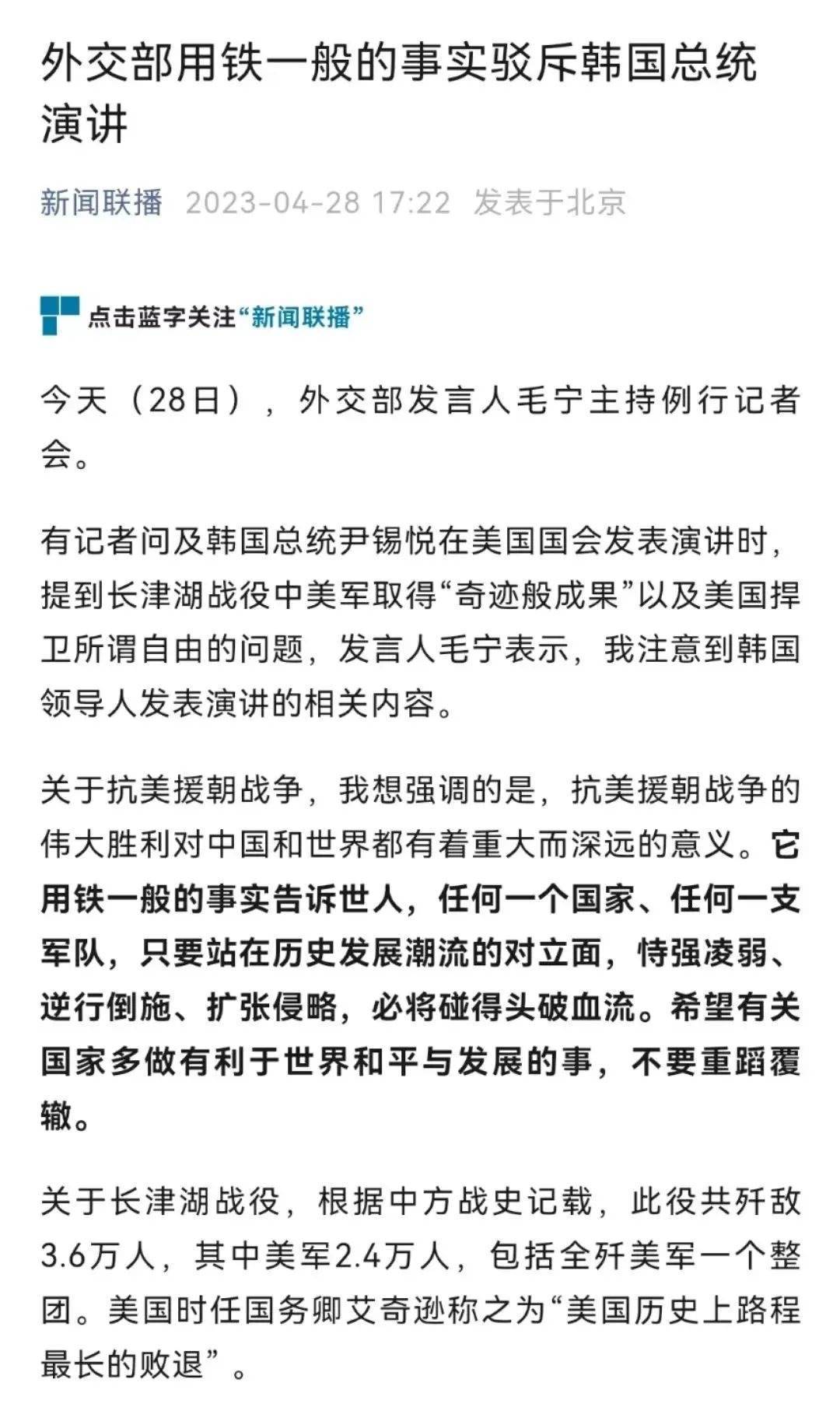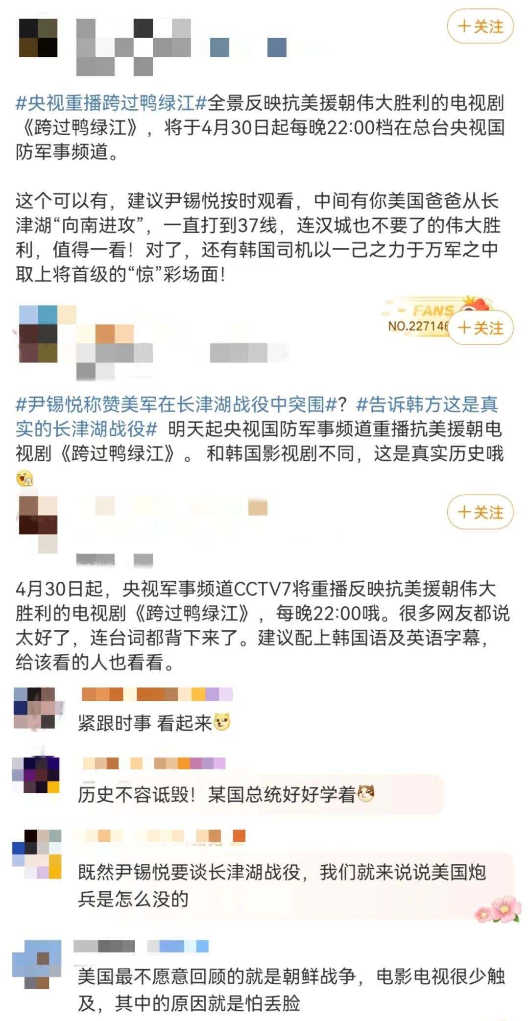 新加坡《聯(lián)合早報(bào)》更在4月30日晚10點(diǎn)準(zhǔn)時(shí)發(fā)布文章《電視劇<跨過鴨綠江>將在中國央視重播》,開篇明確重點(diǎn):在韓國總統(tǒng)稱贊美國海軍陸戰(zhàn)隊(duì)第一師在長津湖戰(zhàn)役中的表現(xiàn)后,中國央視稱將從星期天(4月30日)起重播電視劇《跨過鴨綠江》。