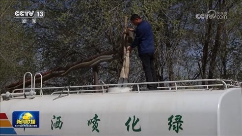 在甘肅八步沙林場(chǎng),曾經(jīng)寸草不生的沙漠被嫩綠的沙生植物所覆蓋。眼下,林場(chǎng)職工正抓住時(shí)機(jī),為今年新栽的樹苗澆“安苗水”。