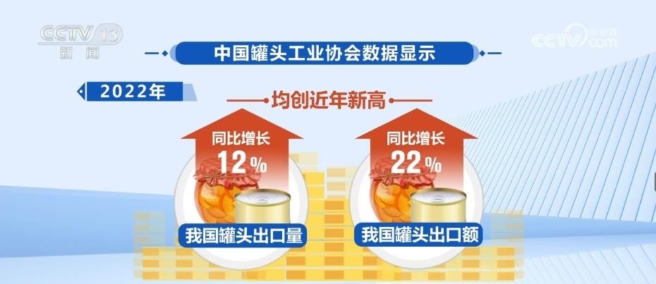 來(lái)自中國(guó)罐頭工業(yè)協(xié)會(huì)的數(shù)據(jù)顯示,近年來(lái),中國(guó)罐頭在海外熱銷,出口量持續(xù)躍升。2022年,我國(guó)罐頭出口量和出口額同比分別增長(zhǎng)了12%和22%,均創(chuàng)近年新高。中國(guó)已經(jīng)多年位居罐頭生產(chǎn)和出口第一大國(guó),產(chǎn)量約占全球的四分之一。