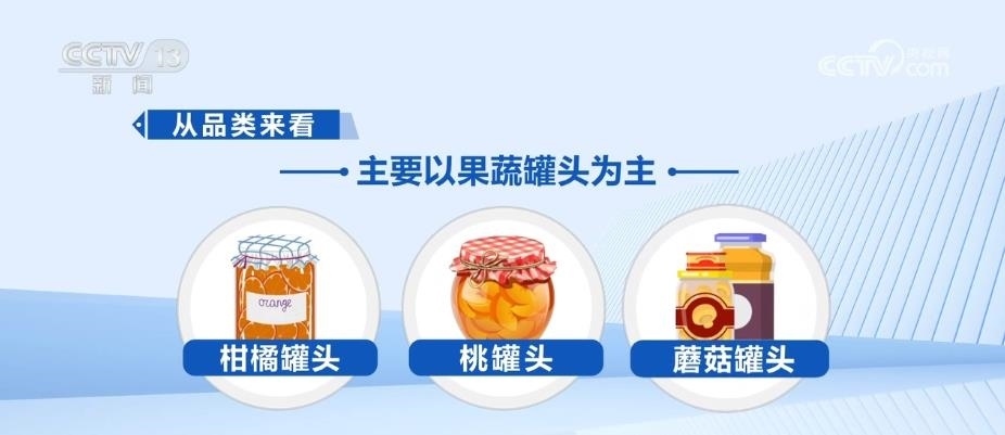 本屆廣交會(huì)上,就有近千種罐頭產(chǎn)品。從品類來(lái)看,主要以果蔬罐頭為主,柑橘罐頭、桃罐頭、蘑菇罐頭等等。另外,番茄醬罐頭以及竹筍罐頭也是中國(guó)果蔬罐頭出口的主要產(chǎn)品。小小中國(guó)罐頭,撬動(dòng)了海外大市場(chǎng)。