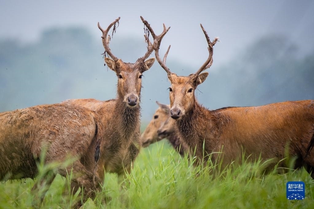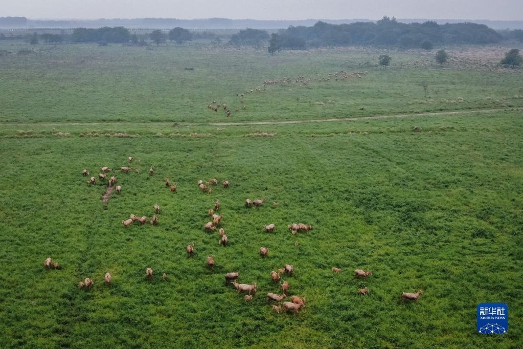 4月28日,一群麋鹿在石首麋鹿國(guó)家級(jí)自然保護(hù)區(qū)活動(dòng)。