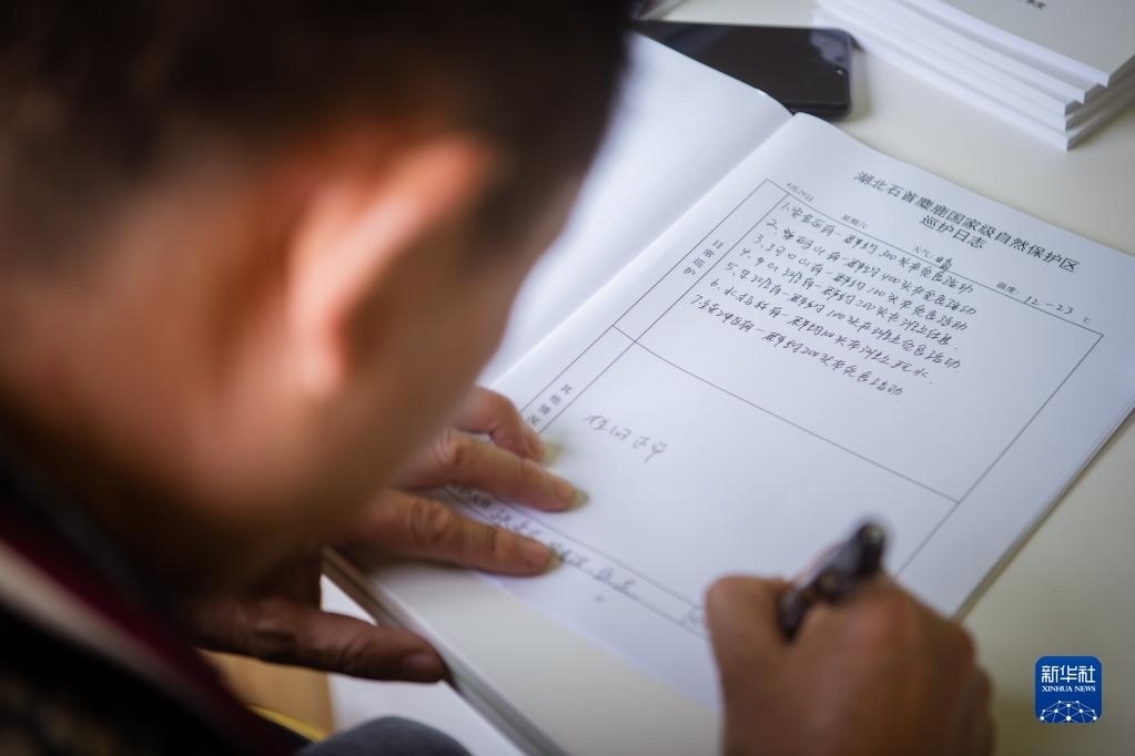 4月29日,在石首麋鹿國(guó)家級(jí)自然保護(hù)區(qū),巡護(hù)員劉吉高填寫巡護(hù)日志。