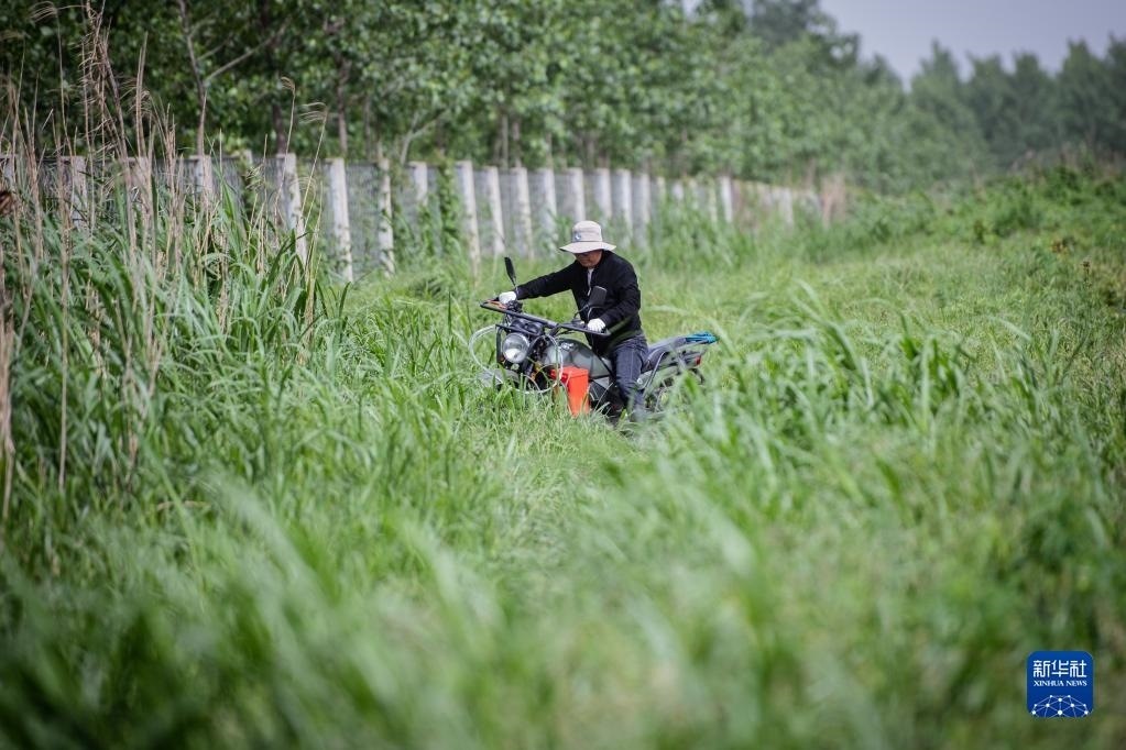4月29日,在石首麋鹿國(guó)家級(jí)自然保護(hù)區(qū),巡護(hù)員王傳軍騎車在齊腰高的野草中巡邏。