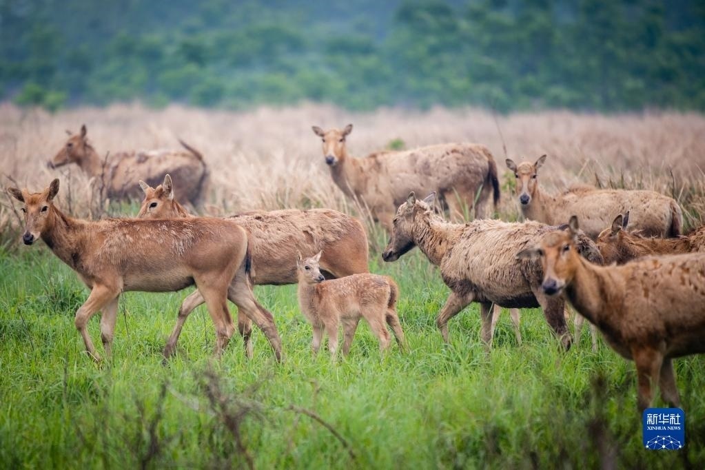 4月28日,幾頭幼鹿跟隨麋鹿群在石首麋鹿國(guó)家級(jí)自然保護(hù)區(qū)內(nèi)活動(dòng)。