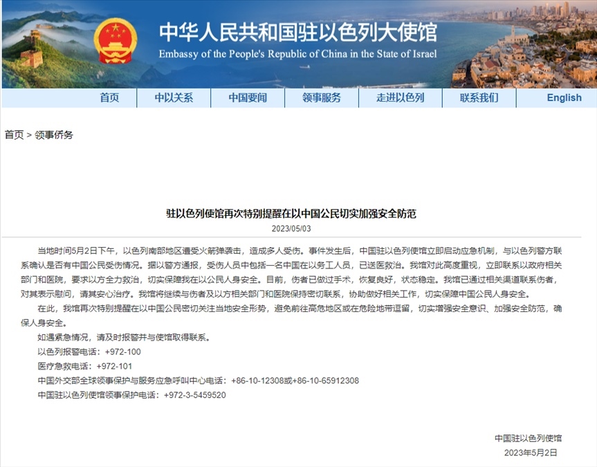 ·一中國公民在火箭彈襲擊中受傷,中國駐以色列使館再發(fā)提醒。