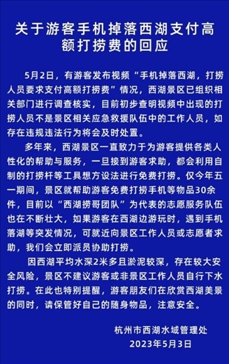 ·西湖景區(qū)回應(yīng)高價(jià)撈手機(jī):非工作人員,接到求助會免費(fèi)打撈。