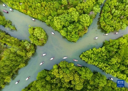 5月2日,游客在江蘇省泰州市姜堰區(qū)溱湖國家濕地公園內(nèi)乘坐搖櫓船游玩。