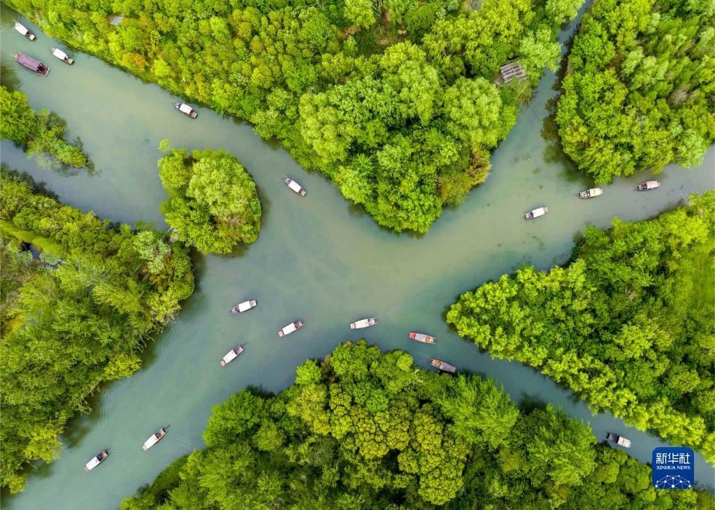 5月2日,游客在江蘇省泰州市姜堰區(qū)溱湖國家濕地公園內(nèi)乘坐搖櫓船游玩(無人機照片)。