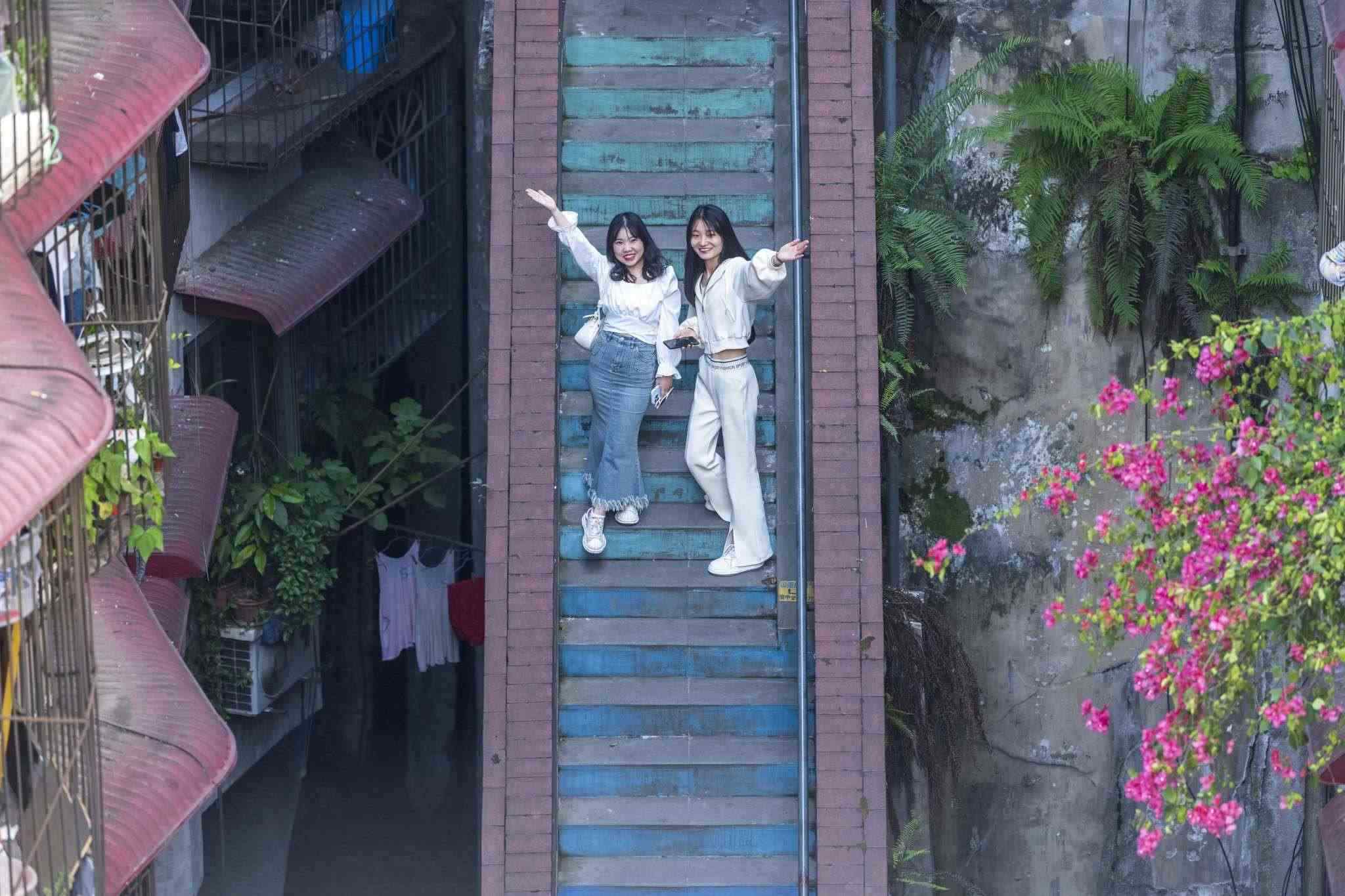 “彩虹樓梯”位于重慶渝中區(qū)枇杷山正街的居民樓間,高約20米,共有50多級(jí)階梯,極具山城特色。經(jīng)過多種顏色涂鴉后,吸引不少市民和攝影愛好者“打卡”。視覺中國