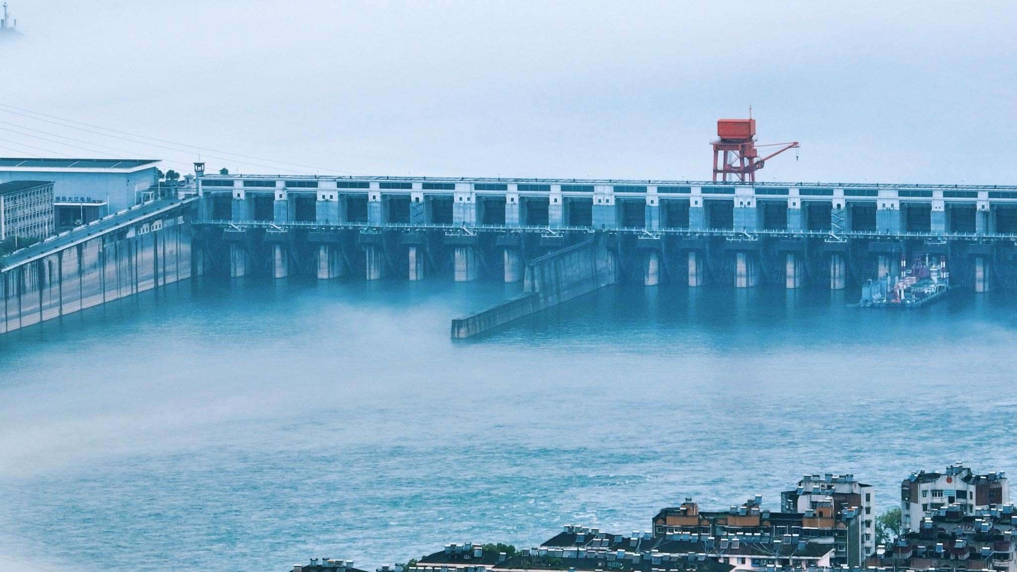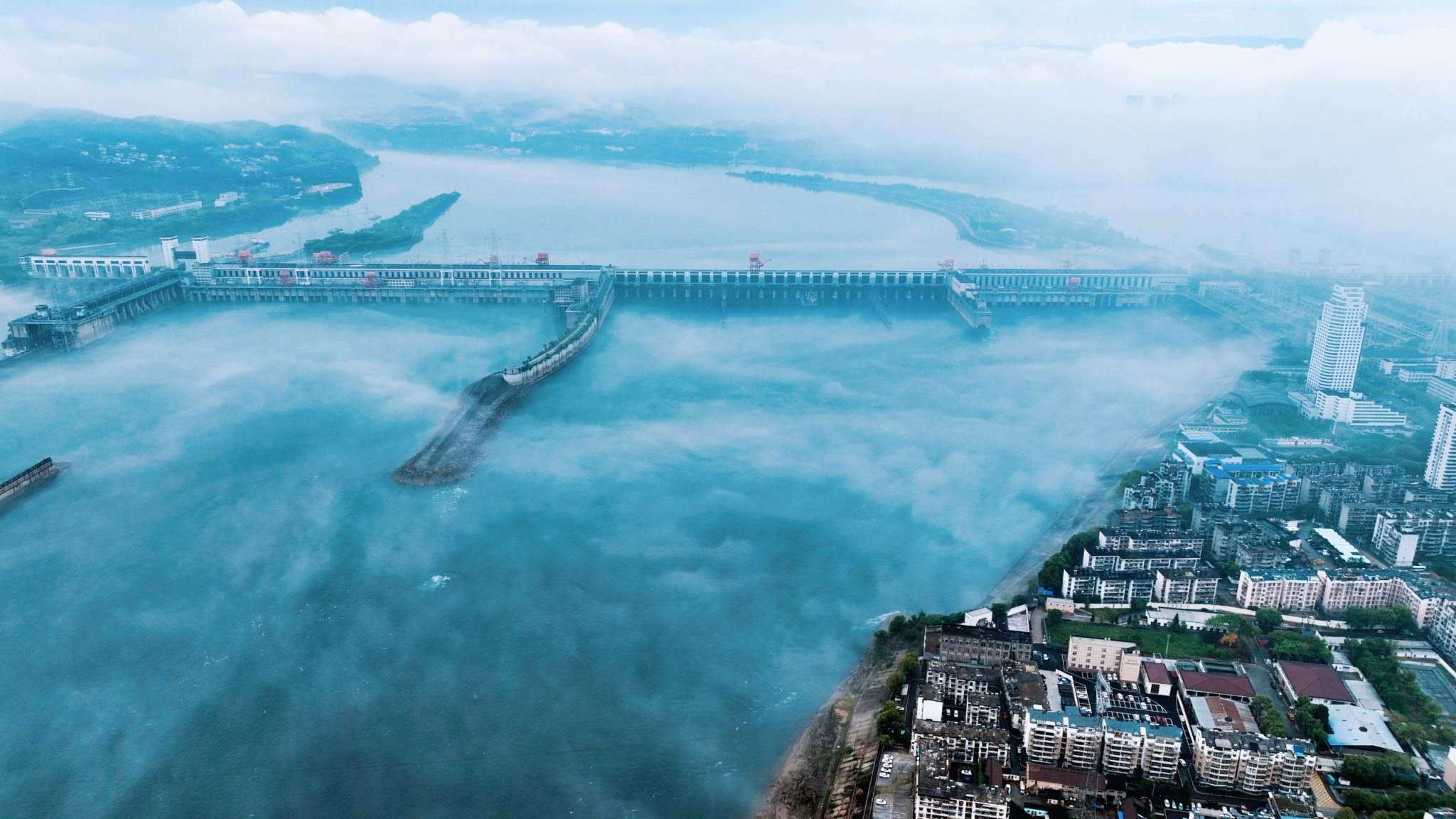 2023年5月4日,湖北宜昌,一場(chǎng)大雨過(guò)后,長(zhǎng)江上薄霧籠罩,城市建筑在霧中若隱若現(xiàn)。視覺(jué)中國(guó)