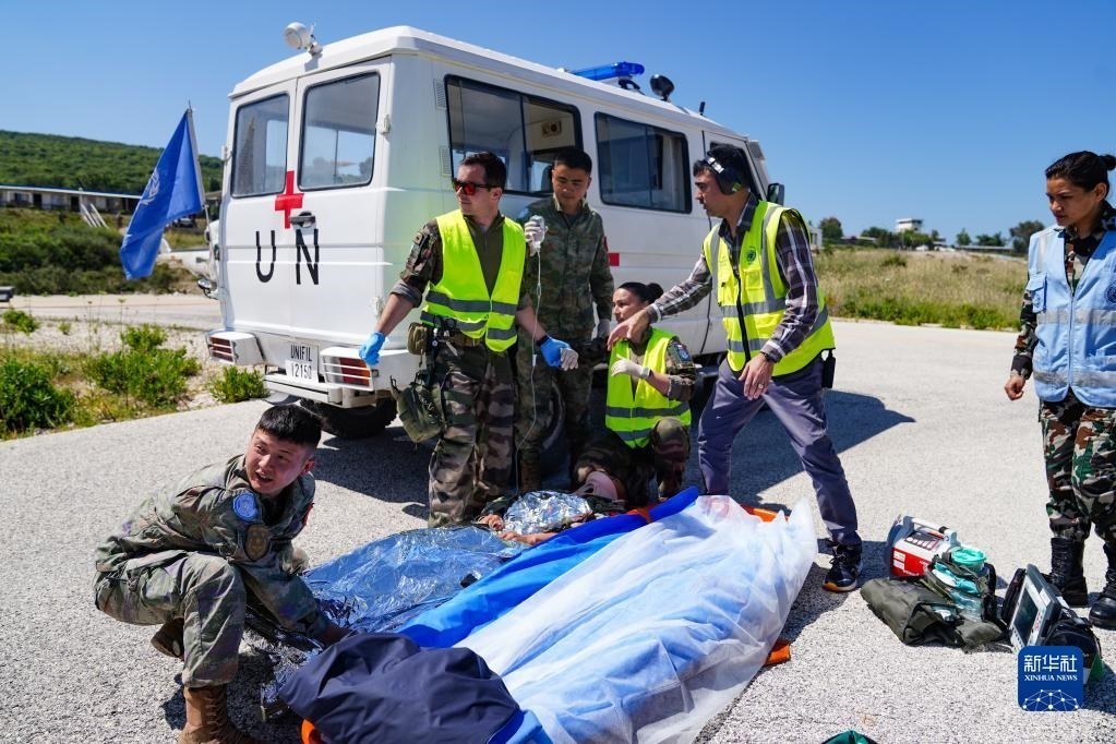 5月3日,在黎巴嫩南部邊境“藍(lán)線(xiàn)”附近雷場(chǎng),參與演習(xí)的中國(guó)第21批赴黎巴嫩維和多功能工兵分隊(duì)醫(yī)療組對(duì)“傷員”傷情進(jìn)行前期處置。