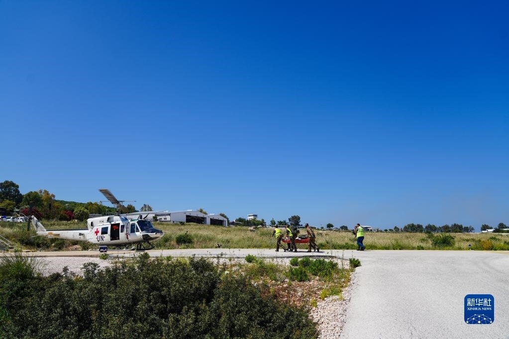 5月3日,在黎巴嫩南部邊境“藍(lán)線(xiàn)”附近雷場(chǎng),參與演習(xí)的中國(guó)第21批赴黎巴嫩維和多功能工兵分隊(duì)隊(duì)員使用救援直升機(jī)轉(zhuǎn)運(yùn)“傷員”。