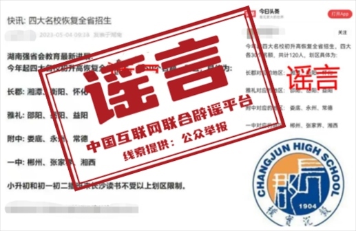 真相:近日,一些網(wǎng)站和自媒體平臺(tái)發(fā)布“今年起,長(zhǎng)郡中學(xué)、雅禮中學(xué)、湖南師大附中、長(zhǎng)沙市一中等長(zhǎng)沙‘四大名校’初升高恢復(fù)全省招生”的信息引發(fā)關(guān)注。5月4日,湖南省教育廳對(duì)此發(fā)布聲明稱,此消息為不實(shí)消息。湖南省自2021年全面規(guī)范普通高中招生,禁止跨區(qū)域招生,并對(duì)違規(guī)招生行為進(jìn)行嚴(yán)肅查處。請(qǐng)大家不信謠不傳謠。(來源:湖南省教育廳微信公眾號(hào))