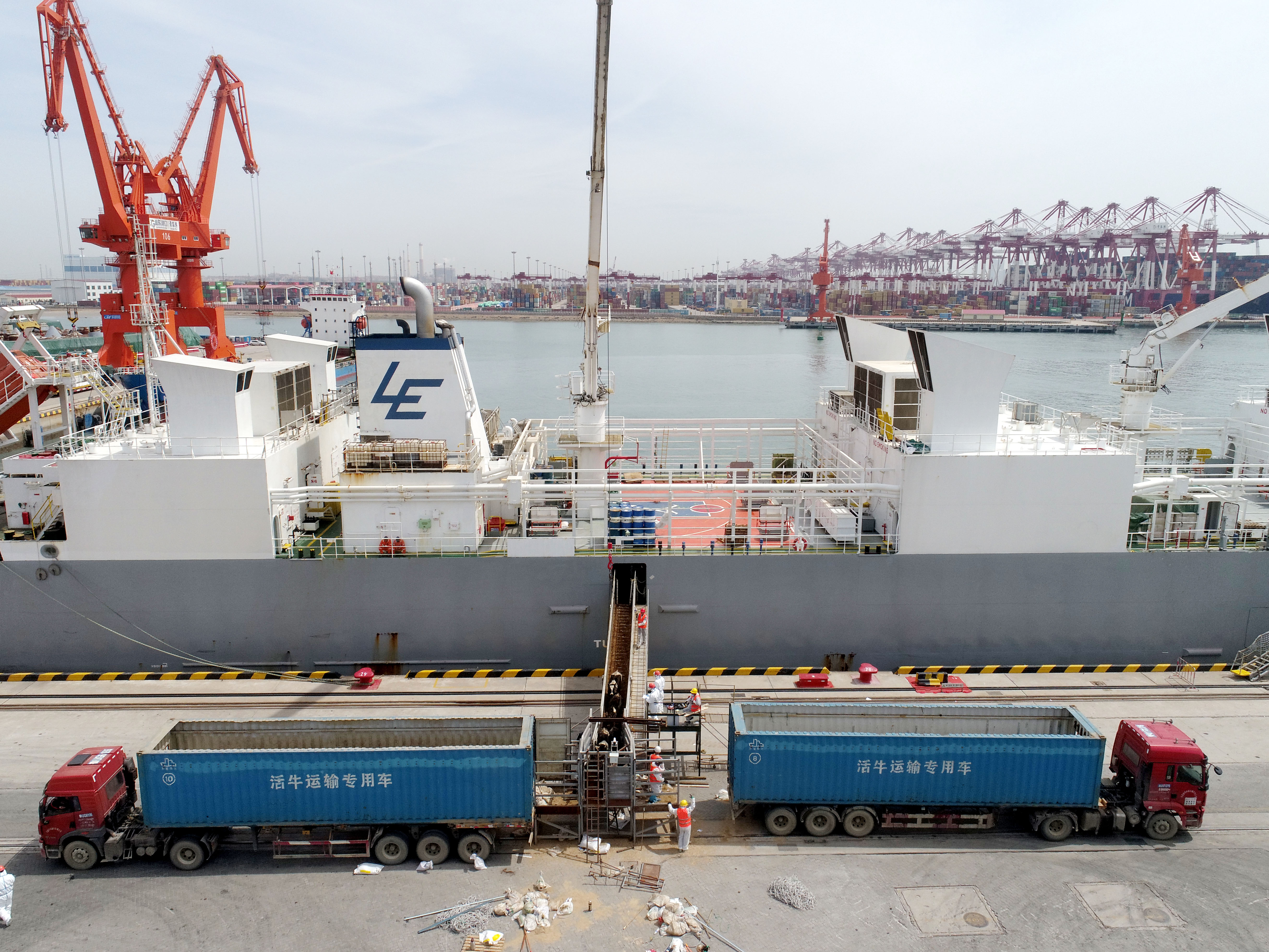 5月8日,在山東港口青島港前灣集裝箱碼頭,3000余頭活牛卸船轉(zhuǎn)運。