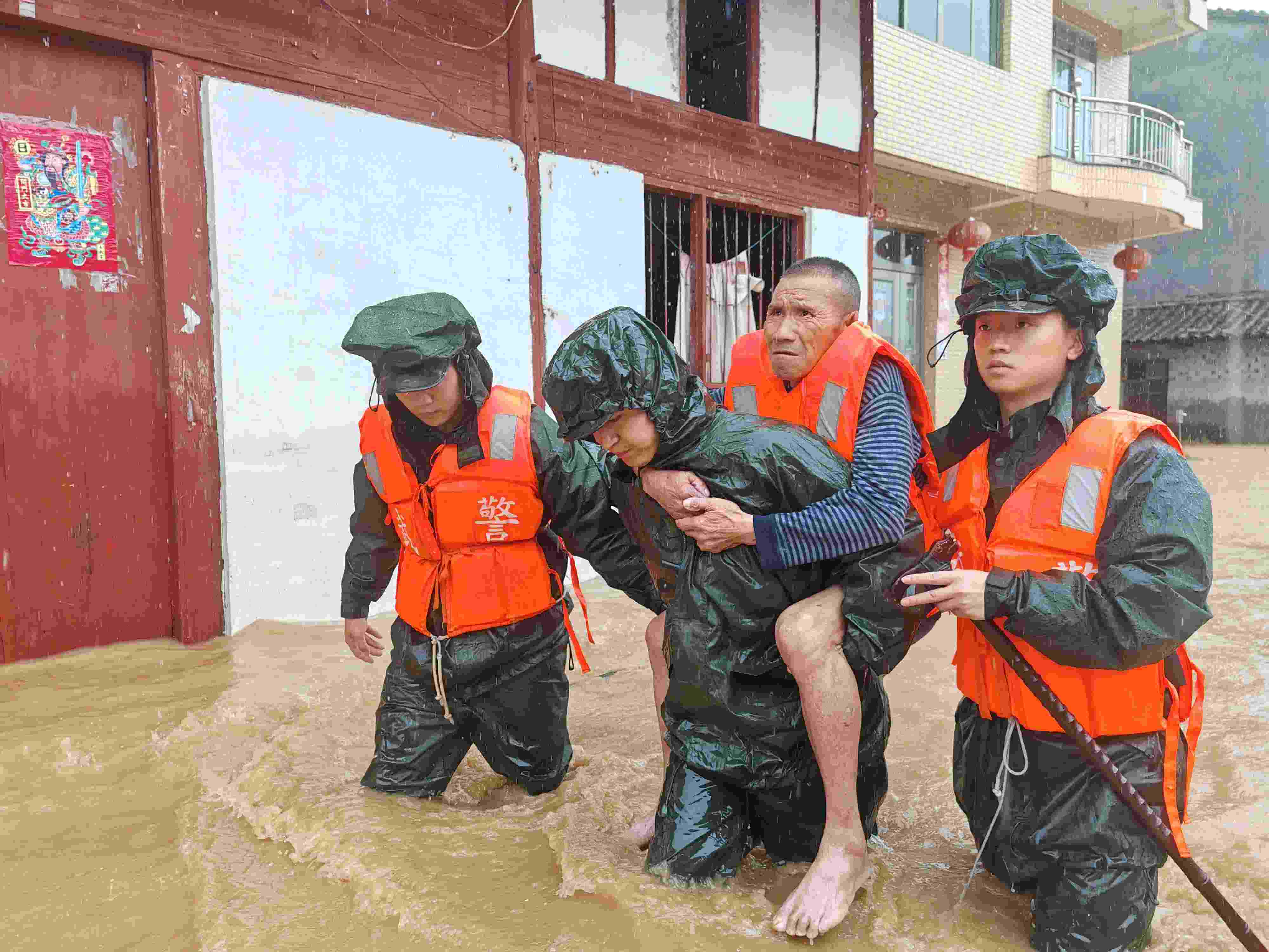 2023年5月6日,江西撫州,宜黃縣梨溪鎮(zhèn),武警撫州支隊官兵在轉移被困群眾。 視覺中國