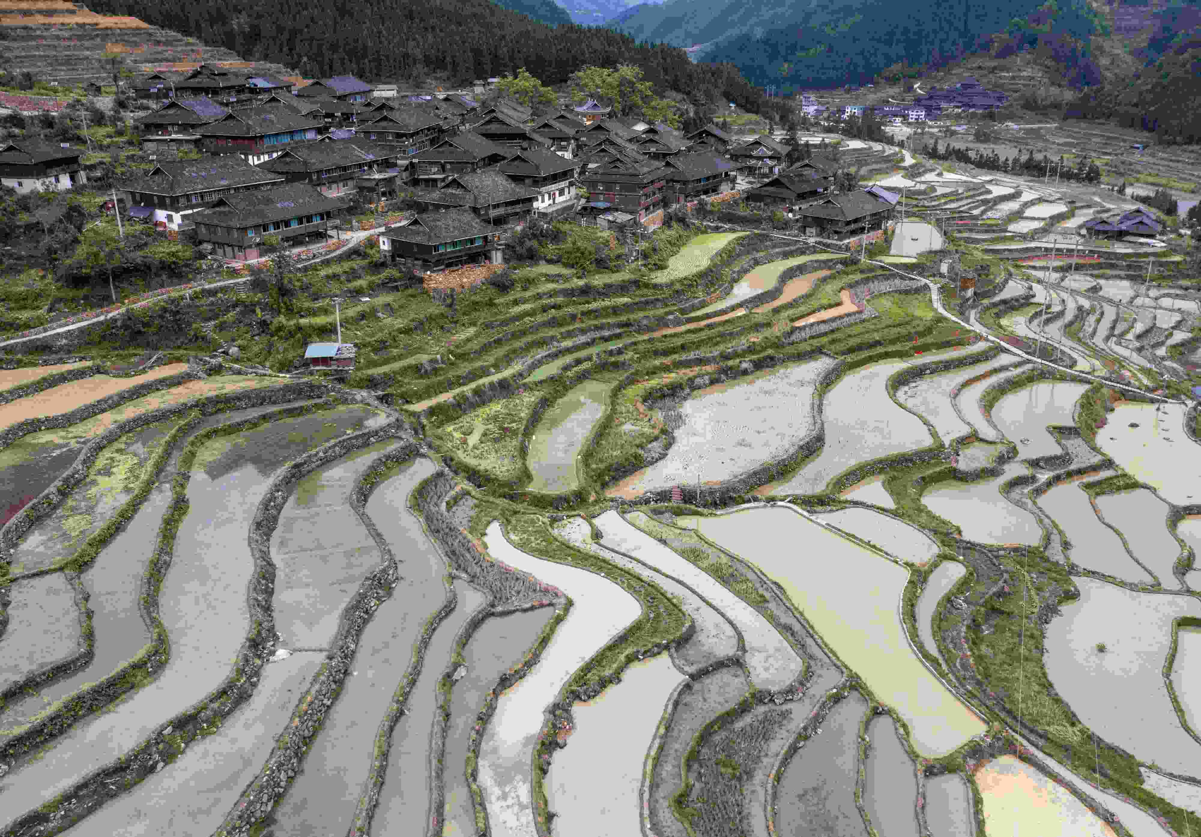 2023年5月7日,貴州省黔東南苗族侗族自治州,從江縣剛邊壯族鄉(xiāng)境內(nèi)田園生機(jī)勃勃,翻耕后的層層梯田和青山、河流、村落相映成趣,構(gòu)成一幅鄉(xiāng)村美景圖畫(huà)。
