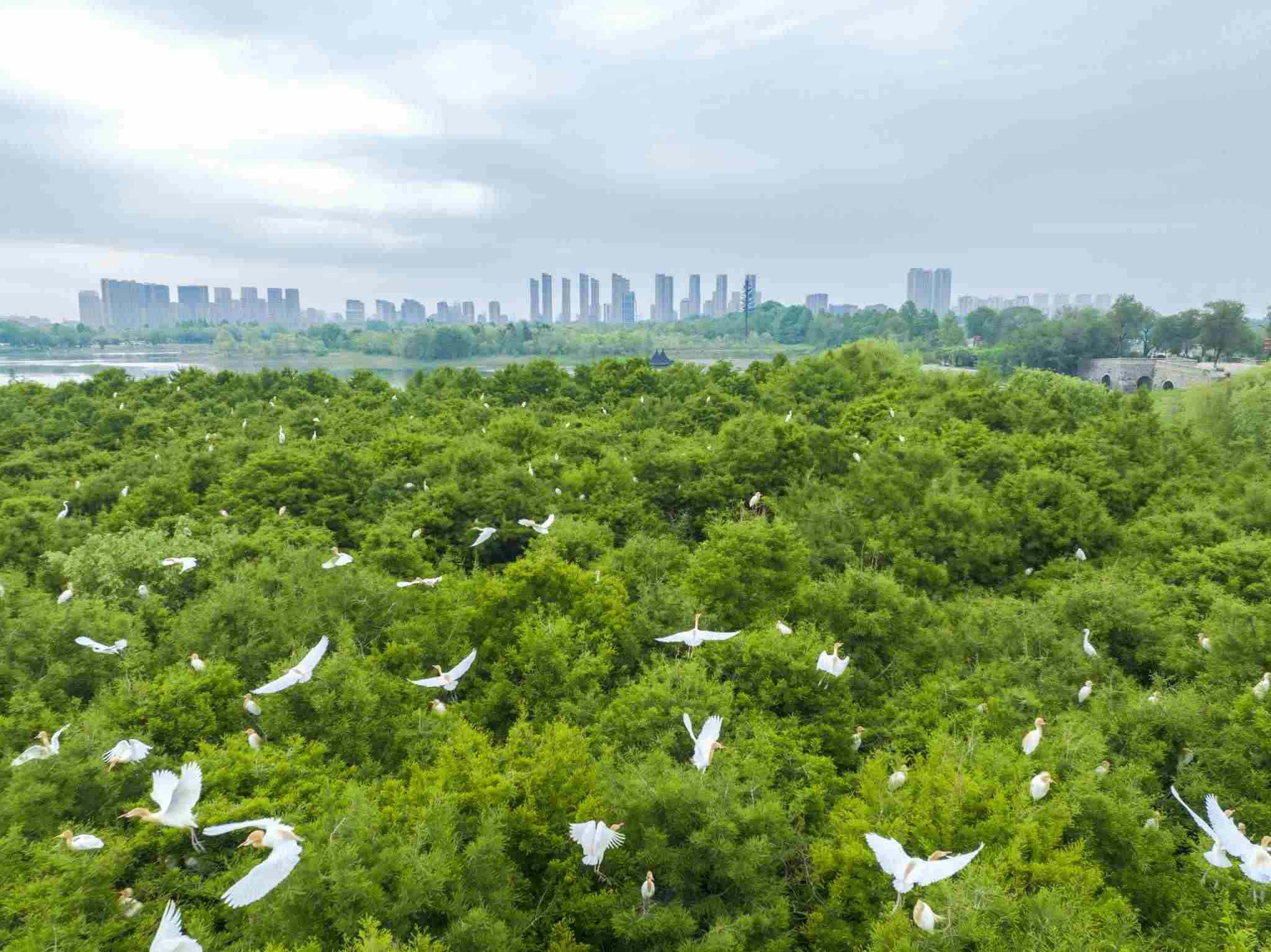 2023年5月11日,江蘇連云港,東海縣西雙湖濕地公園,上千只鷺鳥前來棲息繁衍。視覺中國