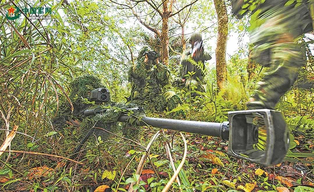 引擎轟鳴,鐵翼飛旋。直升機到達預(yù)定空域后,偵察隊員接續(xù)索降,落地后迅速組成戰(zhàn)術(shù)隊形進行滲透。叢林深處,狙擊組快速占領(lǐng)狙擊陣位,警戒組持續(xù)監(jiān)視“敵”動態(tài),偵察組前出偵察,并將目標信息快速上報指揮所。