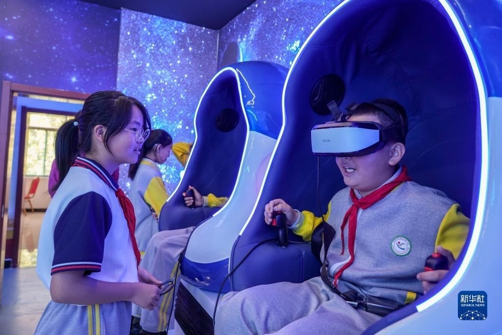 5月11日,小學生在馬店村科普體驗中心內(nèi)體驗VR科普展品。