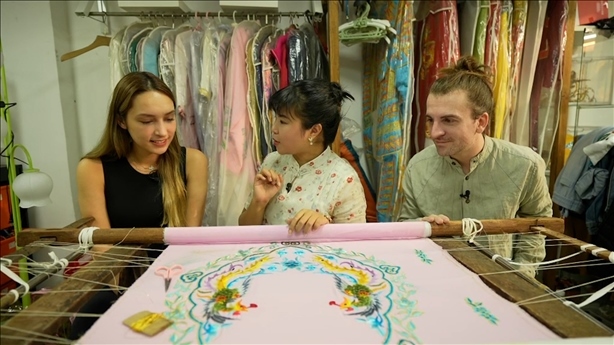 “老板,我是來做戲服模特”“我來考察非遺文化項目”美國的潘明花和意大利徐天佑一起來到狀元坊戲服工廠,戲服刺繡傳承人何鳳婷熱情地講述著戲服刺繡的歷史、制作工序、角色樣式,也讓他們親自體驗了刺繡。潘明花驚嘆于刺繡工藝遠比想象中要復雜得多。他們穿著戲服走近粵劇博物館,深入了解以粵劇為代表的嶺南文化。徐天佑表示戲服刺繡非遺的傳承不僅是技術工藝的傳承,同時也是文化的傳承。何鳳婷說如何讓更多年輕人喜愛和關注這項手藝,如何能繼續(xù)傳承下去是目前亟待解決的問題。為了讓刺繡與現(xiàn)代審美相結(jié)合,老板將刺繡工藝與年輕人喜愛的IP玩偶組合,將“激活非遺+創(chuàng)新思路+文化傳承”理念融入到刺繡中,讓這門手藝更面向大眾,推動非遺的創(chuàng)造性轉(zhuǎn)化,提高與現(xiàn)代生活的緊密度,成為融入現(xiàn)代生活中的潮流元素,讓非遺重煥光彩。