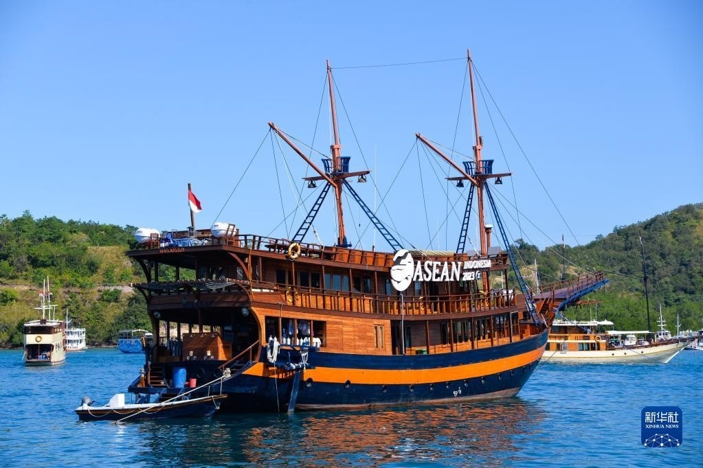這是5月12日在印度尼西亞拉布安巴焦海邊拍攝的一艘掛著2023年東盟峰會(huì)標(biāo)志的游船。