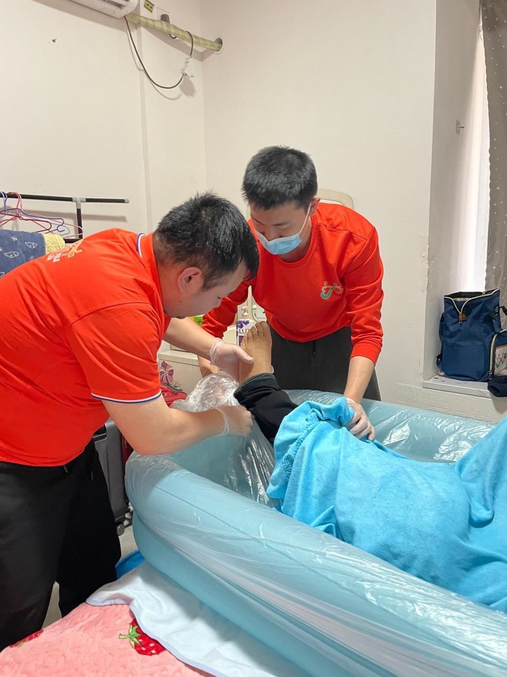 這樣的助浴服務(wù),晏楊俊祺已經(jīng)完成了200多次,每一次都是磨人的“大工程”。身為四川福樂家綜合養(yǎng)老服務(wù)有限責任公司的助浴師,上門服務(wù)前,他都要初步掌握老人病史、皮膚情況、血壓血糖、是否有自主活動能力等基本信息,據(jù)此做好各項準備,同時發(fā)給老人家屬一些有關(guān)助浴流程和內(nèi)容的視頻。服務(wù)時,對于失能老人,助浴師還需分工協(xié)作,通常一人主要負責洗澡,一人負責陪老人說話并觀察身體狀態(tài),還有一人負責換水、幫忙抬抱老人等,整個服務(wù)過程大約1個小時。