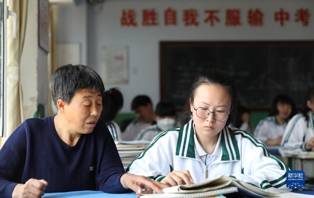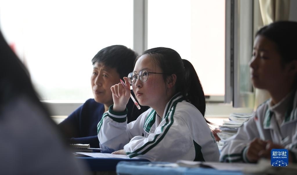 張連琴(左下)和女兒李昕偉在教室內(nèi)聽課(5月8日攝)。