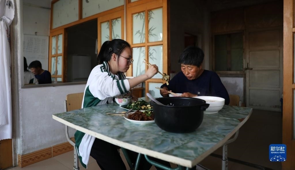 晚餐中的李昕偉為媽媽夾菜(5月7日攝)。