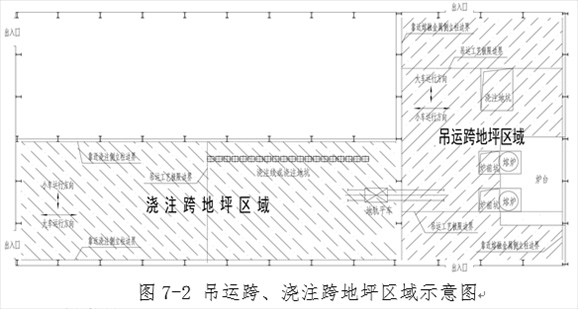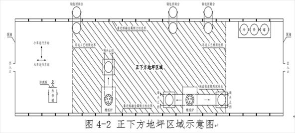 注:“正下方地坪區(qū)域”是指橫向以吊運跨兩側立柱靠近熔融金屬吊運側的立柱邊線為界,縱向以吊運跨最兩端的鐵水、鋼水、液渣吊運工藝極限邊界為界的車間地坪區(qū)域(圖4-2)。