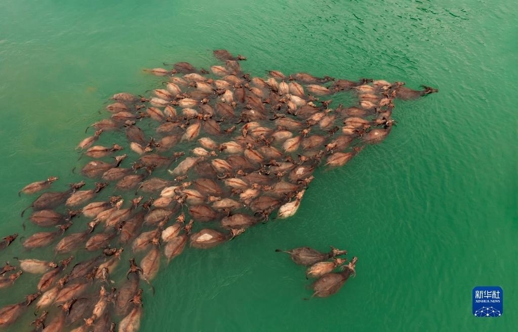 5月13日,在南充市蓬安縣相如鎮(zhèn)油房溝村嘉陵江段,成群結(jié)隊(duì)的水牛渡江(無(wú)人機(jī)照片)。