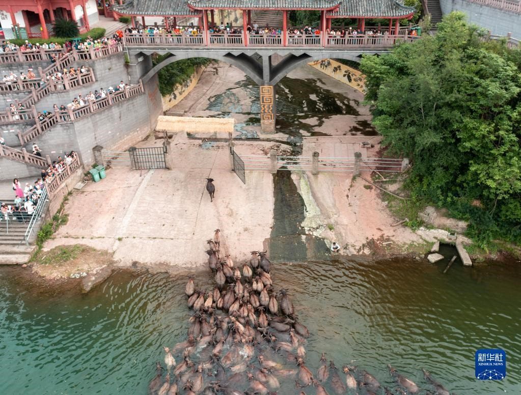 每年4-10月,在四川省南充市蓬安縣相如鎮(zhèn)油房溝村嘉陵江段,成群結(jié)隊(duì)的水牛在船只的護(hù)送引導(dǎo)下,清晨從岸邊結(jié)隊(duì)游上江心島啃食青草,黃昏又下水回游上岸歸欄,成為當(dāng)?shù)匾坏廓?dú)特的景觀,吸引不少游客前來(lái)觀看。